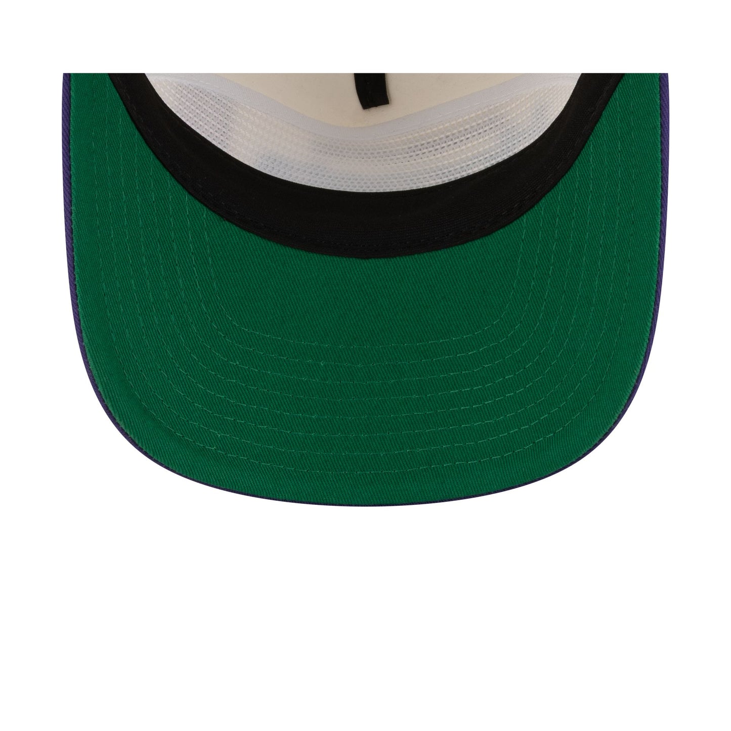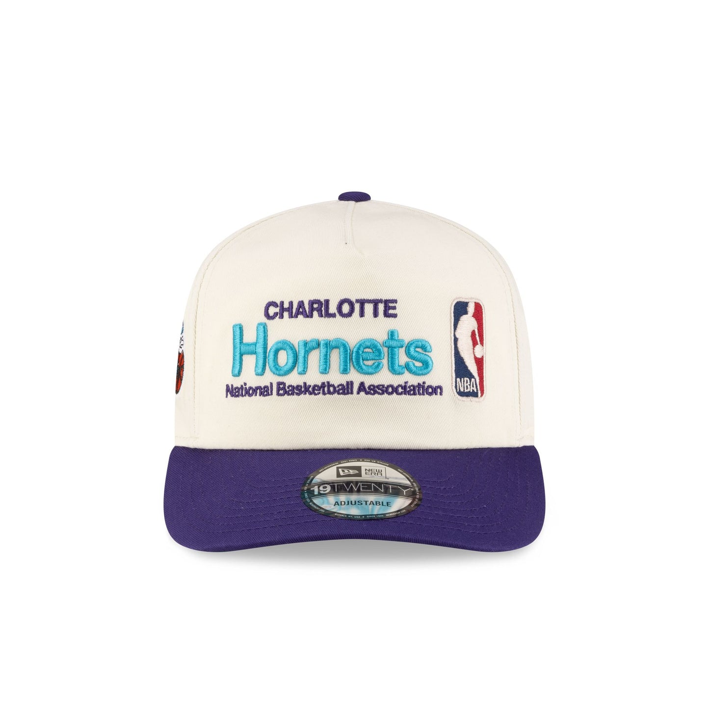 The Charlotte Hornets 1988-2002 Hardwood Classics Sign Stack Chrome White 19TWENTY Adjustable Cap features an embroidered Hornets 1988-2002 Hardwood Classics logo at the right-wear side with a matching digital text and NBA Logoman at the front panels. Additional details include an adjustable snapback closure at the rear and a green undervisor.