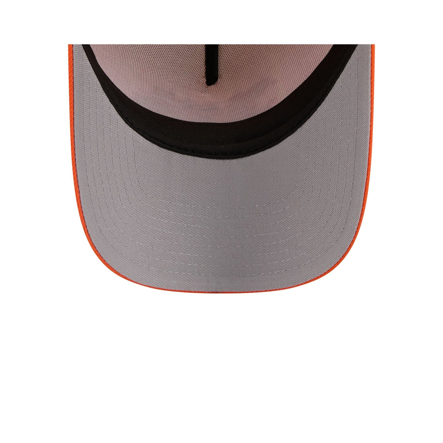 The Charlotte Hornets 2025 City Edition 9FORTY A-Frame Trucker features an embroidered Hornets City Edition logo at the front panels with a logo at the right-wear side. Additional details include the NBA Logoman above an adjustable snapback closure at a mesh rear and a gray undervisor.