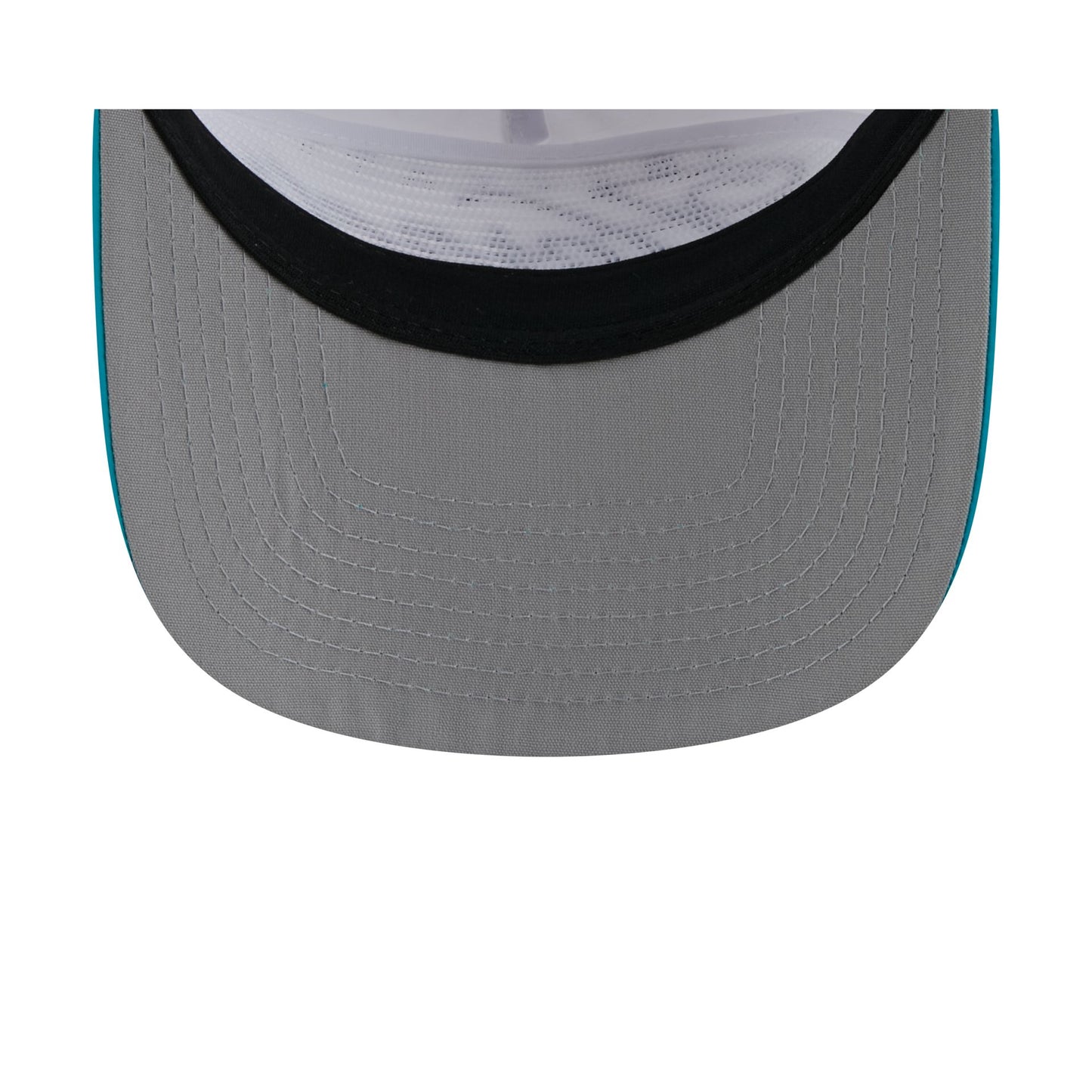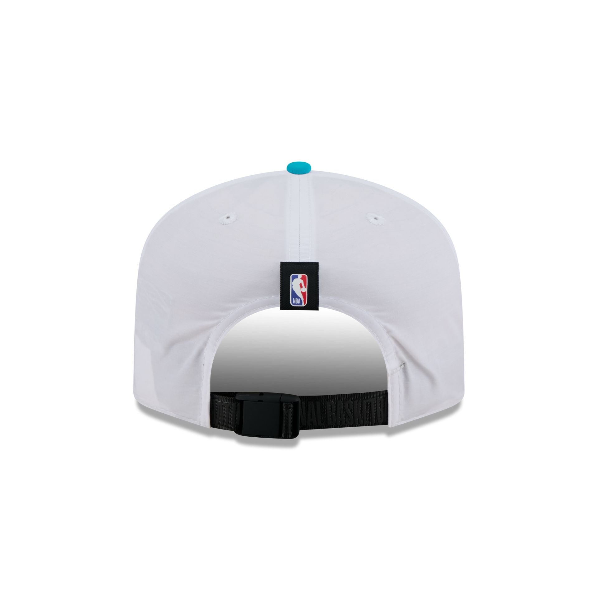 The Charlotte Hornets 2025 Draft 19TWENTY Adjustable Cap features an embroidered Hornets script wordmark at the front panels with a team logo at the right-wear side. Additional details include a woven silicone NBA Logoman patch above an adjustable buckle closure at the rear and a gray undervisor. The strap features a National Basketball Association gel print wordmark.