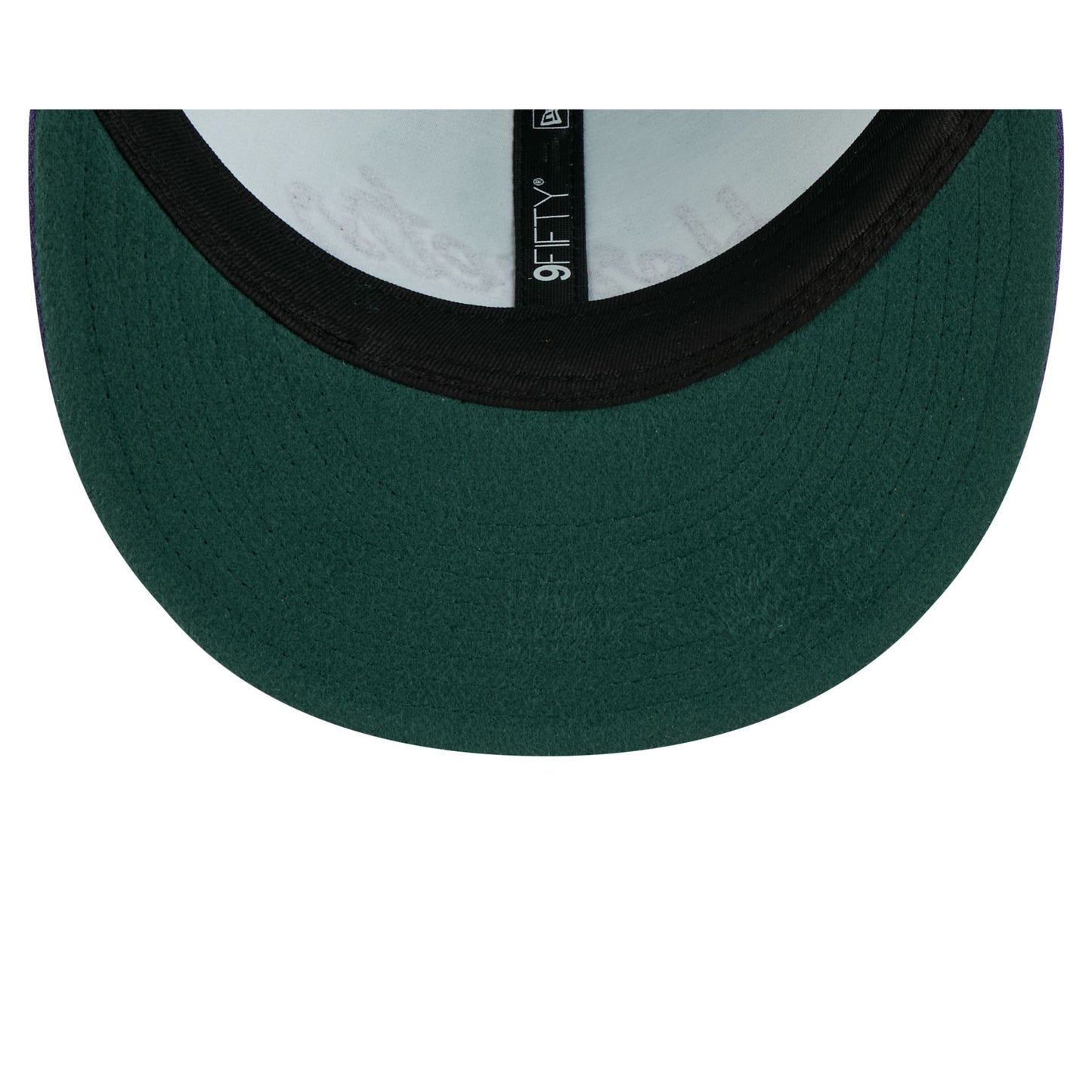 The Charlotte Hornets Chainstitch Script Retro Crown 9FIFTY Snapback features a chainstitch embroidered Hornets script at the front panels with a matching team logo at the right-wear side, an adjustable snapback closure at the rear, and a green Melton wool undervisor.