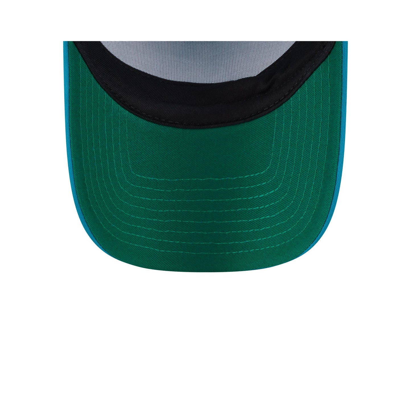 The Charlotte Hornets Distressed 9FORTY A-Frame Trucker features a distressed screen-printed Hornets wordmark and logo at the front panels with a team tag at a snapback closure at the rear and a green undervisor.