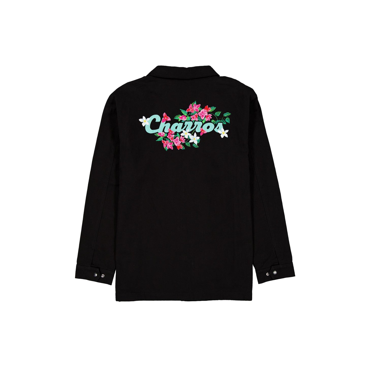 The Charros de Jalisco Black Floral Jacket features an embroidered Charros applique floral logo at the left chest with a matching wordmark at the rear. Additional details include a front button closure, pockets, and adjustable drawstrings at the waist.