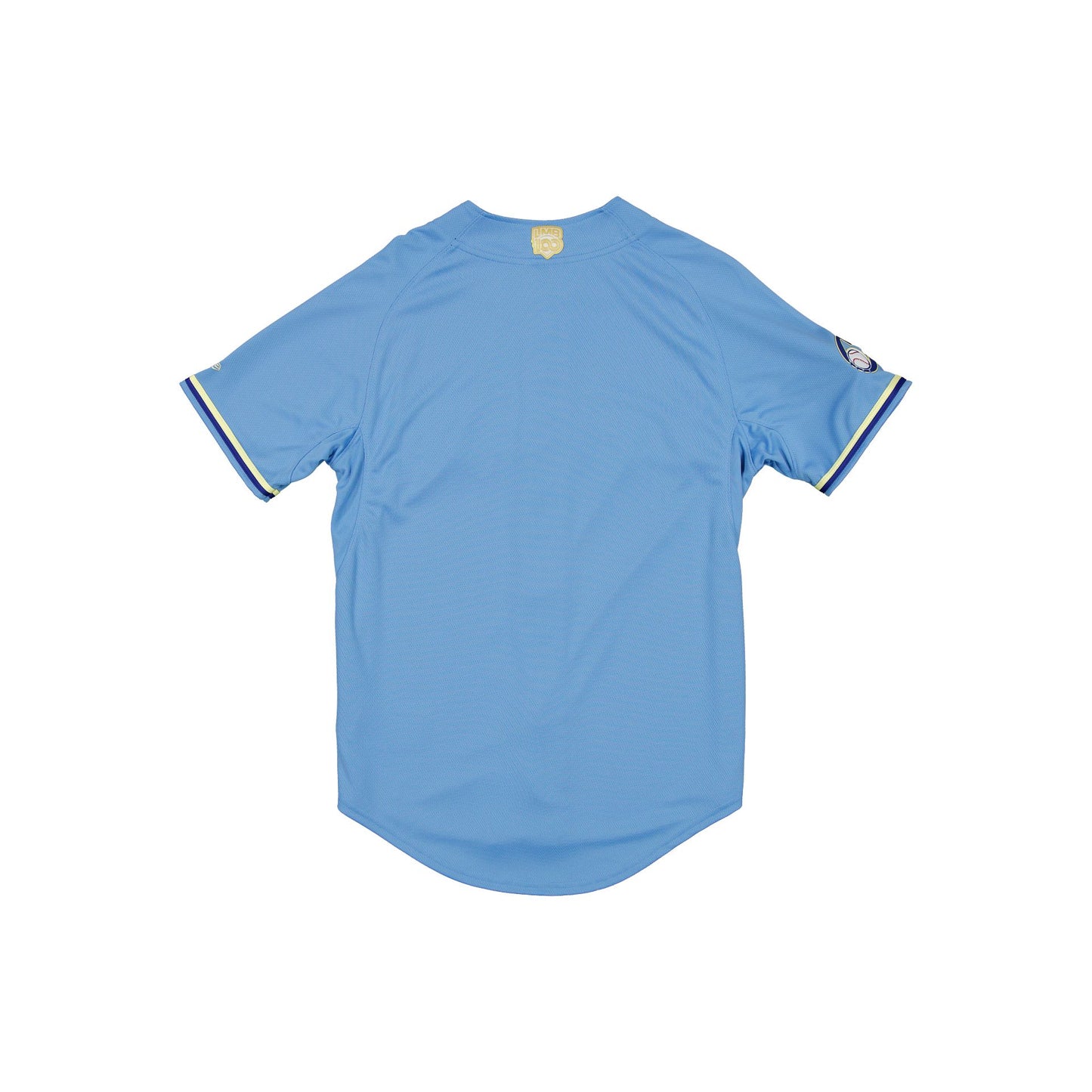 The Charros de Jalisco LMB 100th Anniversary Blue Alt Jersey features an embroidered Charros wordmark at the chest with a New Era Official Merchandise patch at the front hemline, a team logo at the right sleeve, and a LMB 100th Anniversary logo at the rear.