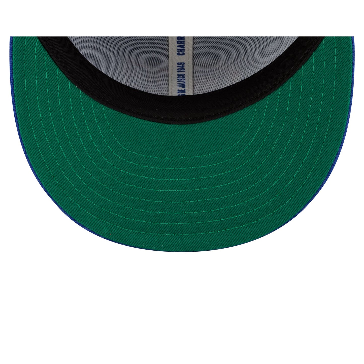 The Charros de Jalisco Retro 59FIFTY Fitted Cap features an embroidered Charros retro logo at the front panels with a 100th Anniversary LMB logo at the rear and a green undervisor.
