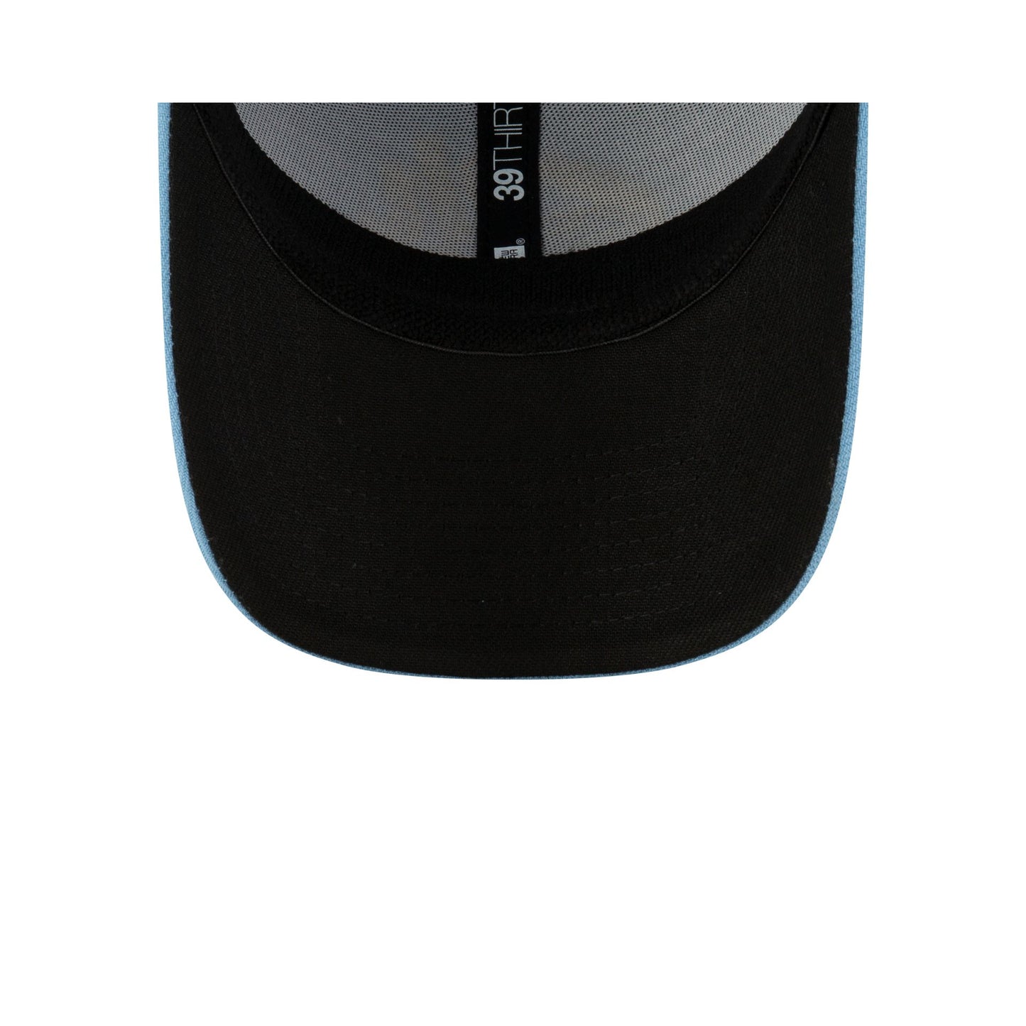 The Charros de Jalisco Sky Blue 39THIRTY Stretch Fit features an embroidered Charros logo at the front panels with a matching LMB logo at the rear and a black undervisor.
