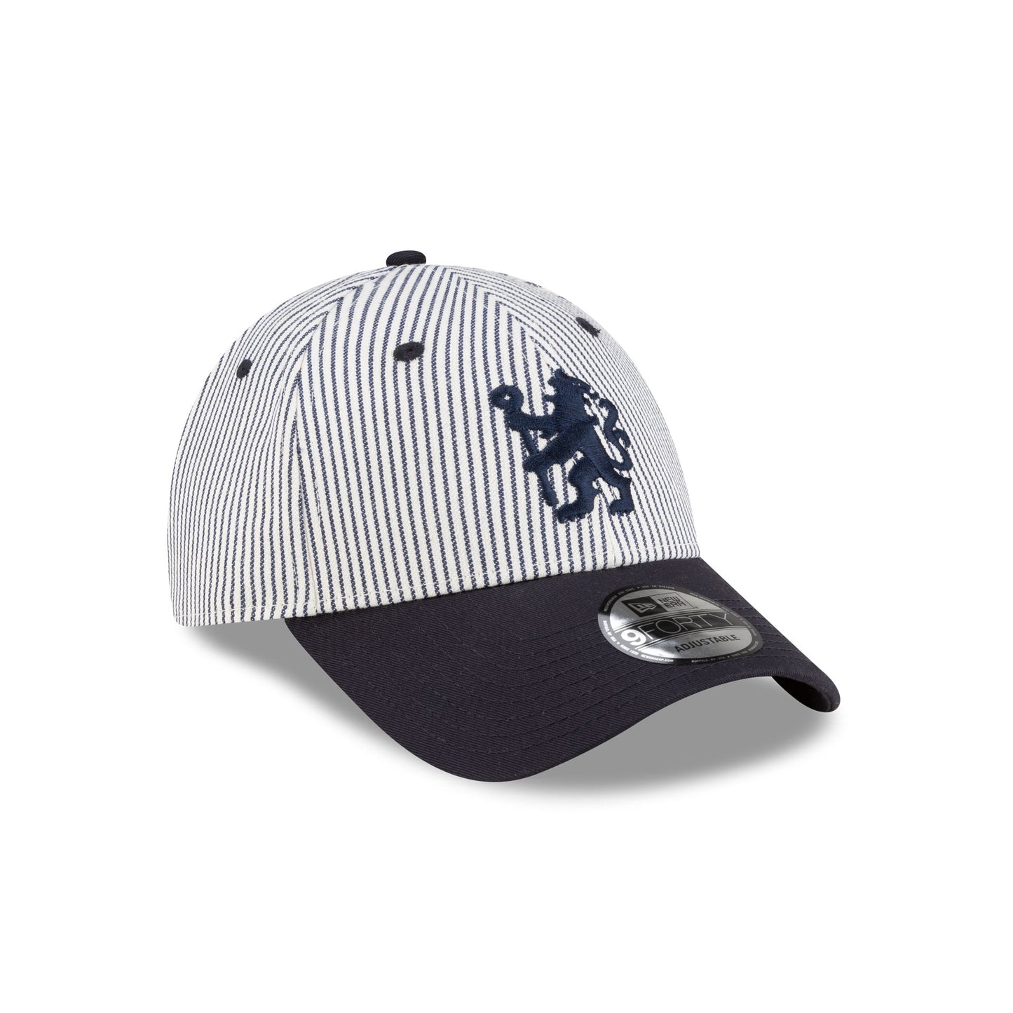 The Chelsea FC Pinstripe 9FORTY Adjustable Cap features an embroidered Chelsea FC logo at the front panels with a pinstripe fabrication throughout and an adjustable D-Ring closure at the rear.