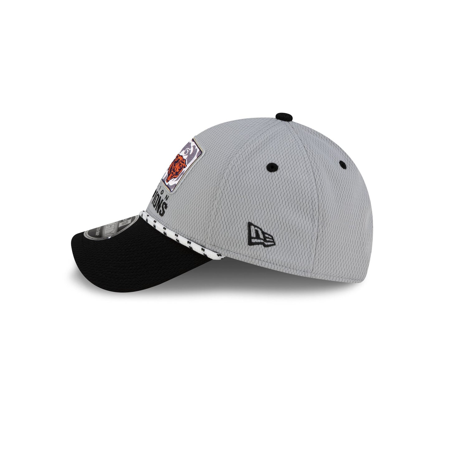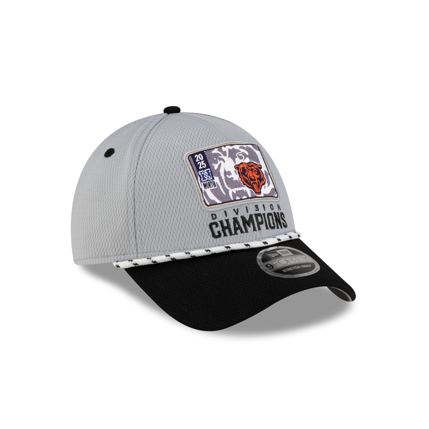 The Chicago Bears 2025 Division Champion Locker Room 9FORTY Stretch-Snap Cap features an embroidered Bears NFC North patch above a Division Champions wordmark at the front panels with an NFL Shield above a stretch-snap closure at the rear, a black visor, and a gray undervisor.