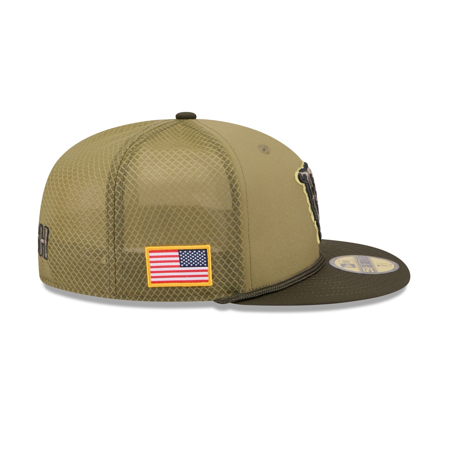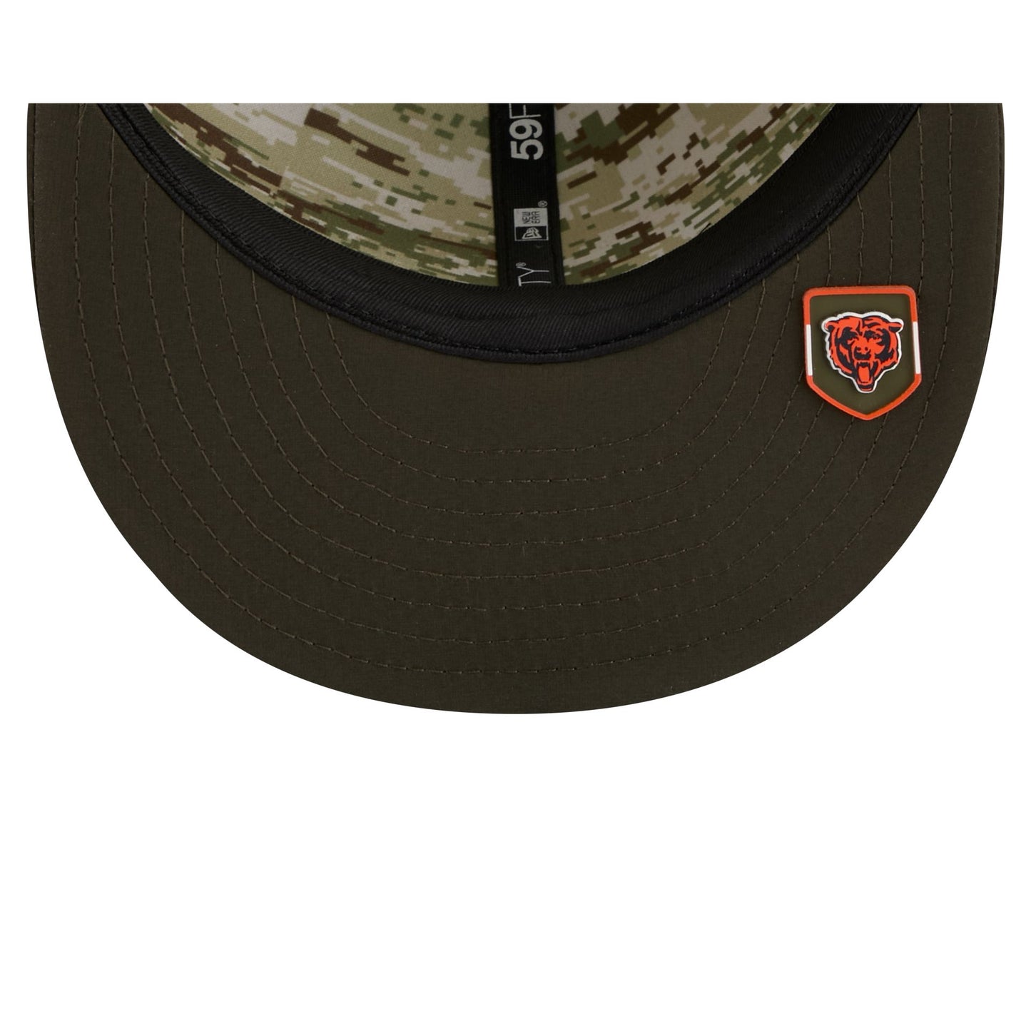 The Chicago Bears 2025 Salute to Service 59FIFTY Fitted Cap features an embroidered Bears logo at the front panels with the official NFL Salute to Service patch at the rear mesh panels. Additional details include an American flag patch at the right-wear side with a silicone team logo patch at a dark green undervisor and a digi camo interior fabrication.