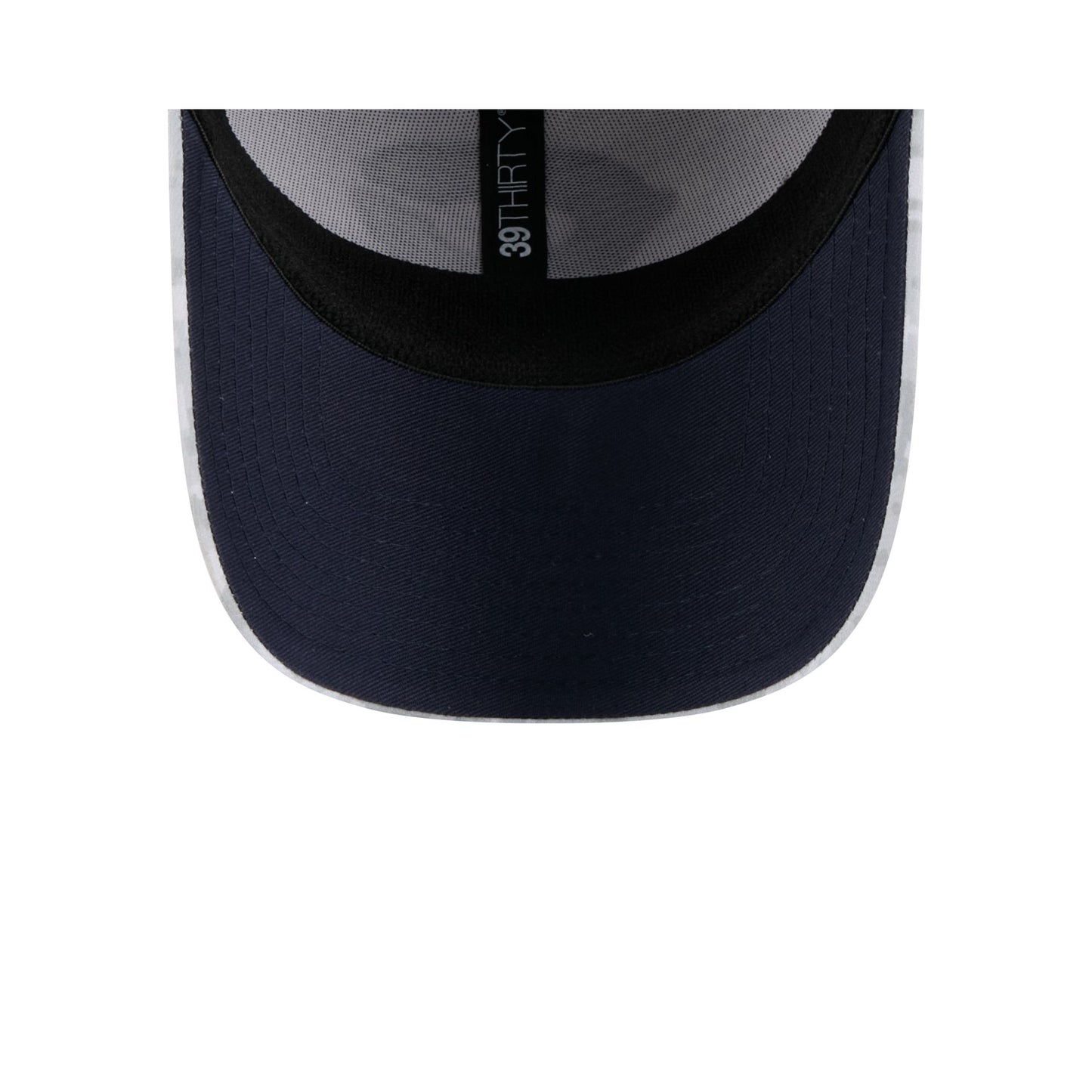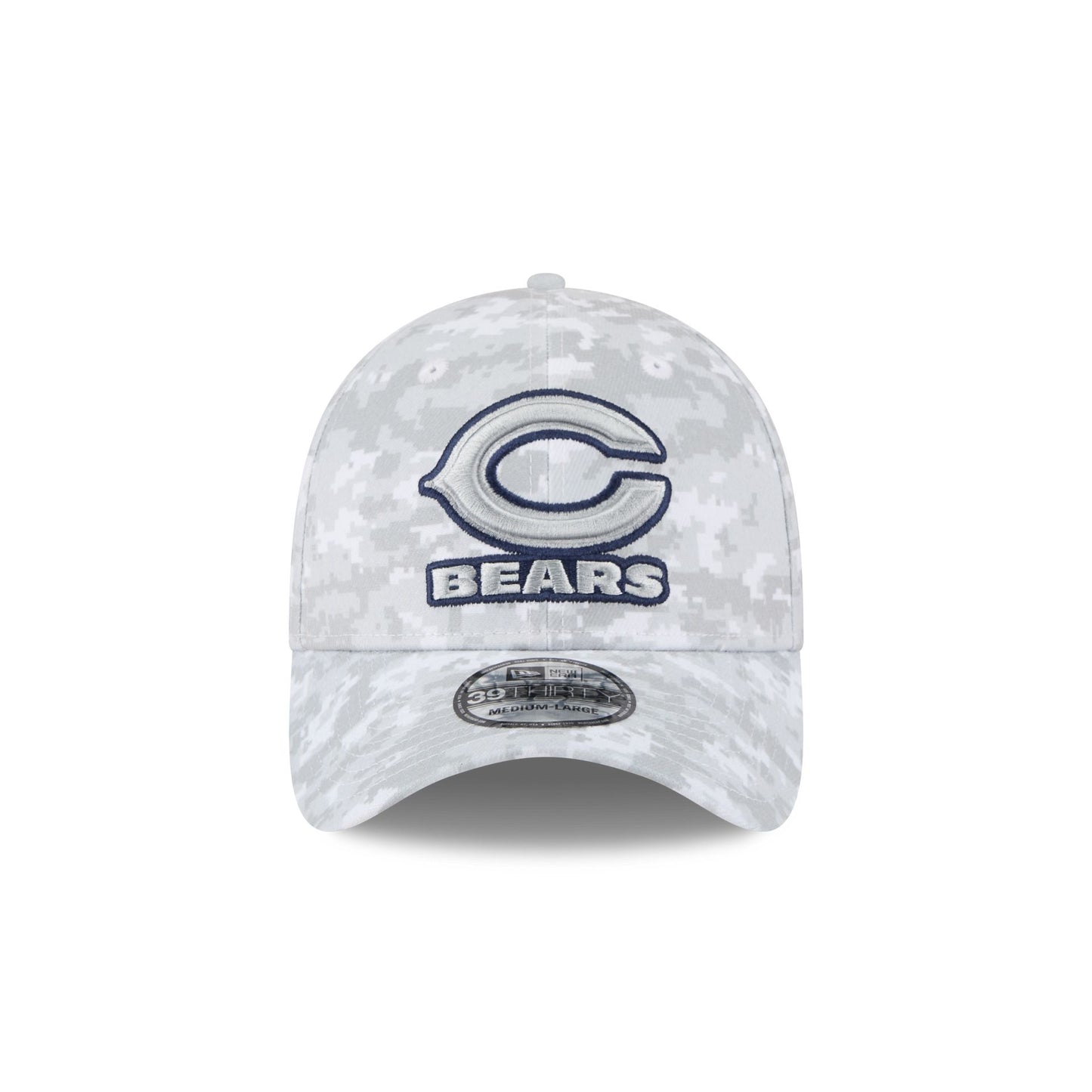 The Chicago Bears 2025 Salute to Service Fan Gear 39THIRTY Stretch Fit Cap features an embroidered Bears logo at the front panels with the official NFL Salute to Service patch at the rear, an American flag patch at the right-wear side, and a team color undervisor.