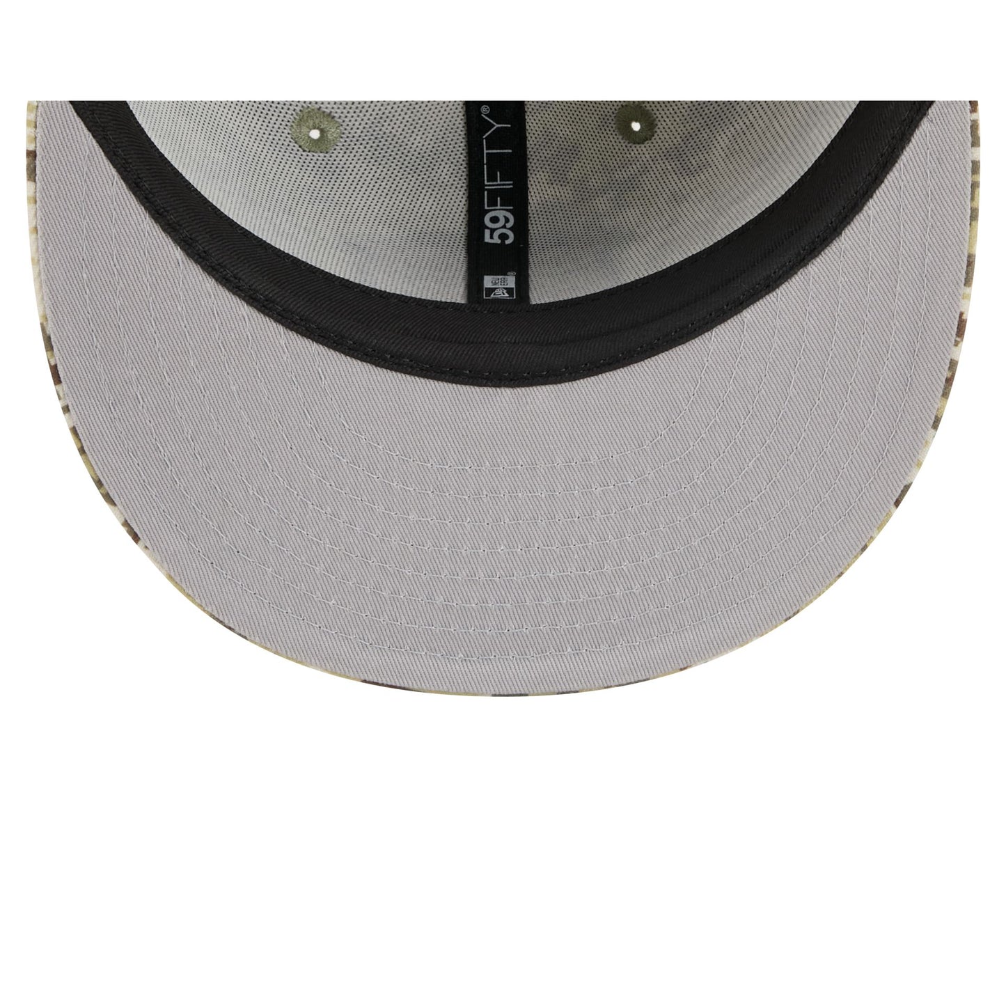 The Chicago Bears 2025 Salute to Service Fan Gear 59FIFTY Fitted Cap features an embroidered Bears logo at the front panels with the official NFL Salute to Service patch at the rear, an American flag patch at the right-wear side, and a gray undervisor.