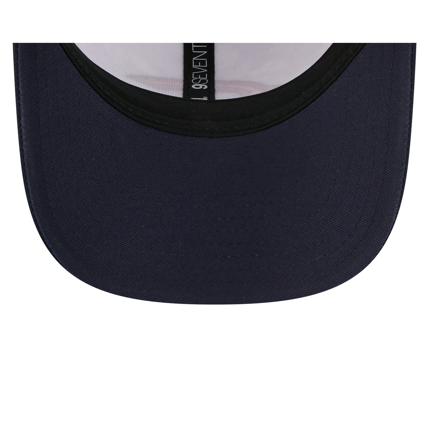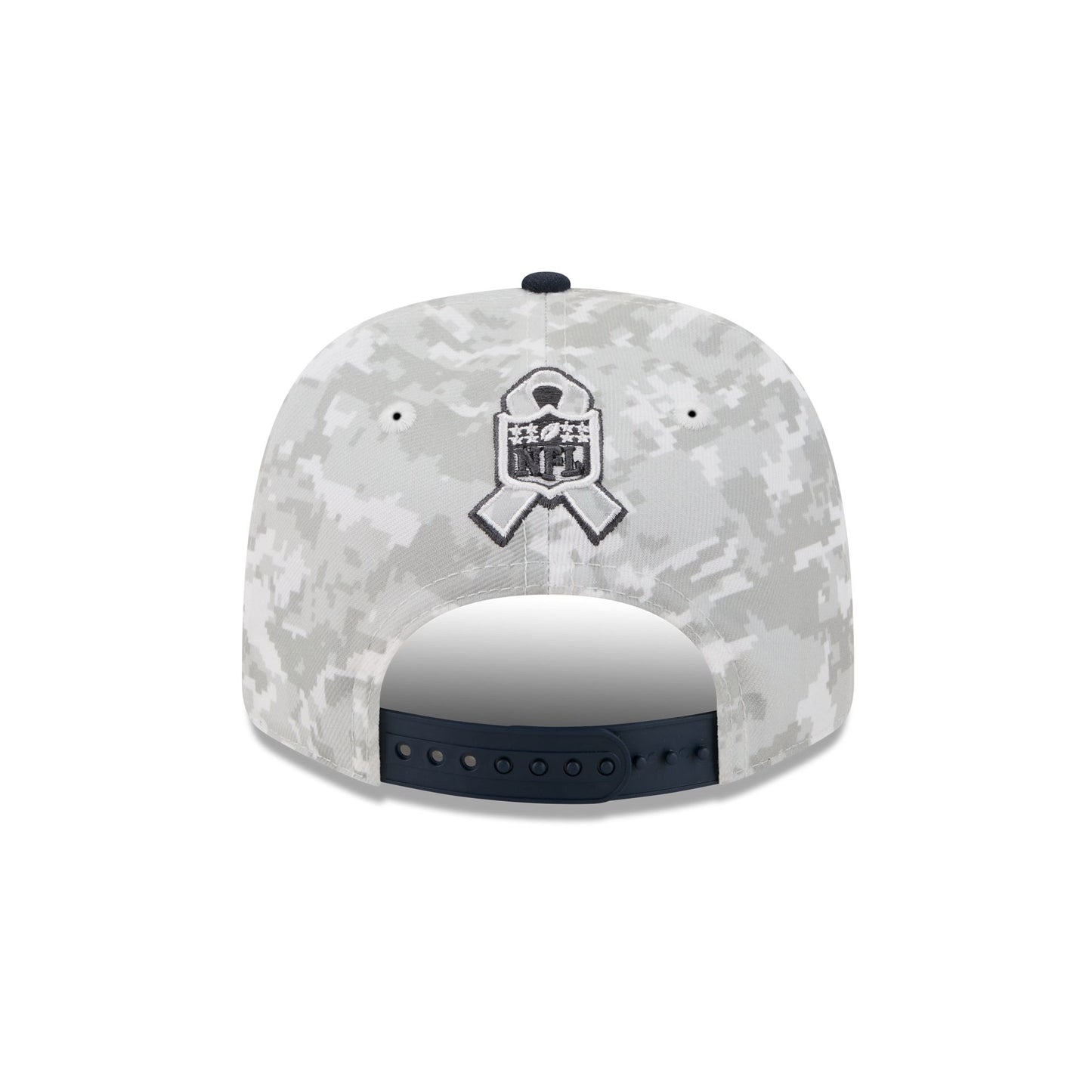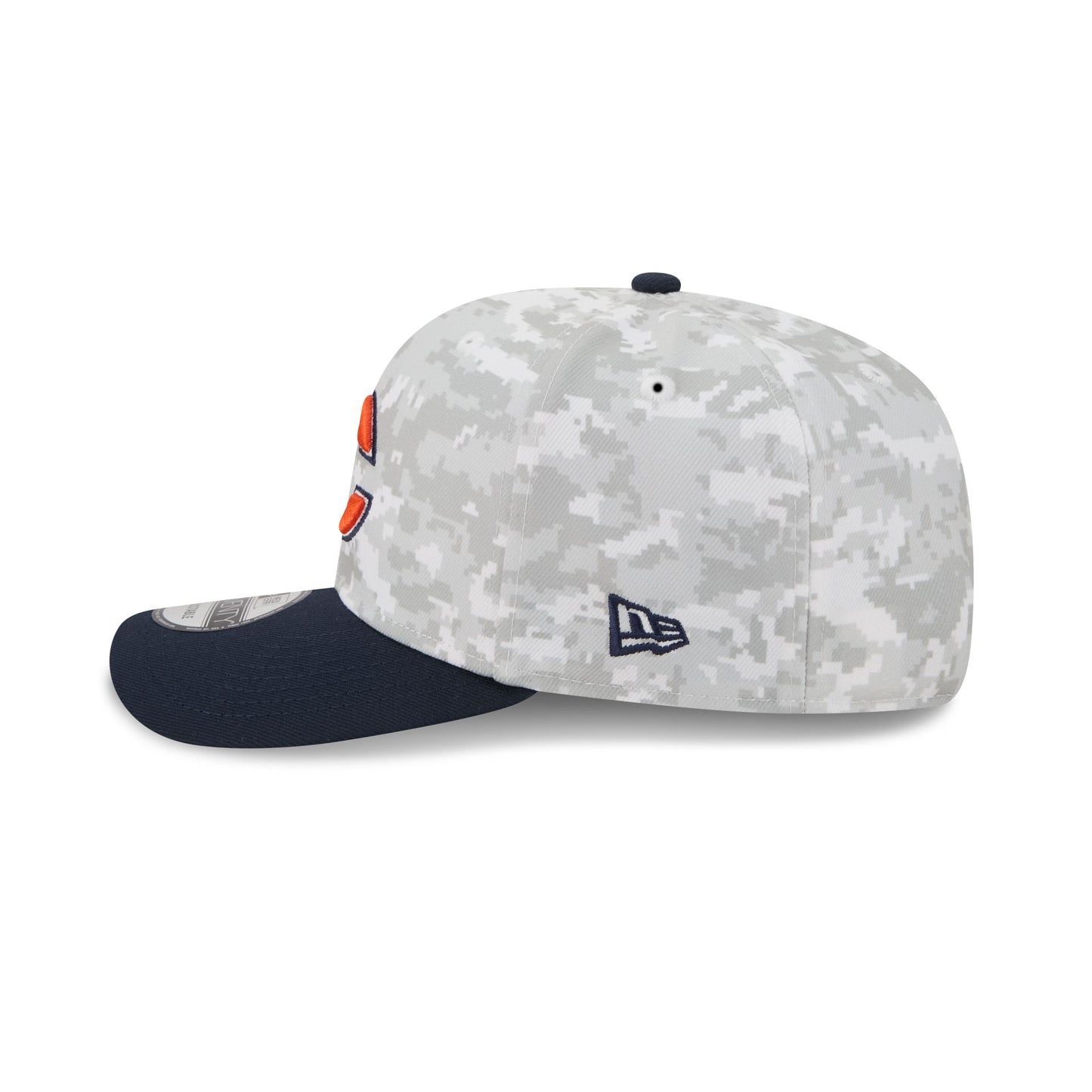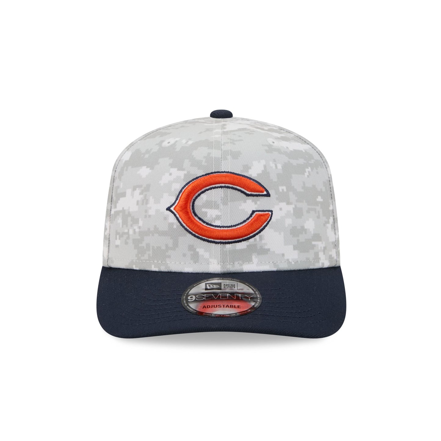 The Chicago Bears 2025 Salute to Service Fan Gear 9SEVENTY Stretch-Snap Cap features an embroidered Bears logo at the front panels with the official NFL Salute to Service patch above a snapback closure at the rear, an American flag patch at the right-wear side, and a team color visor.