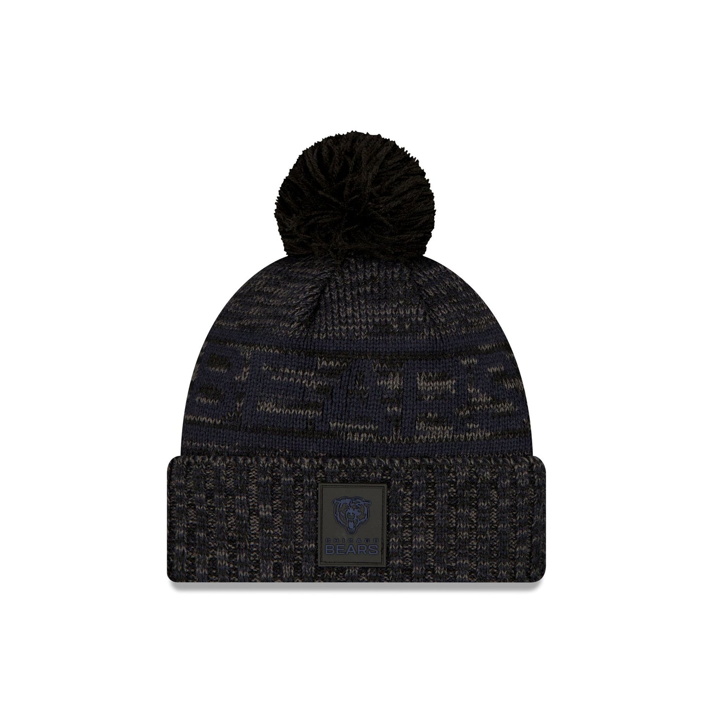 The Chicago Bears 2025 Sideline Cold Weather Black Pom Knit Hat features a sewn-down silicone Bears black logo patch at the front cuff with a matching Official NFL Shield logo at the rear. Additional details include a team wordmark across the crown, a one-time removeable black pom, and a fleece lining.