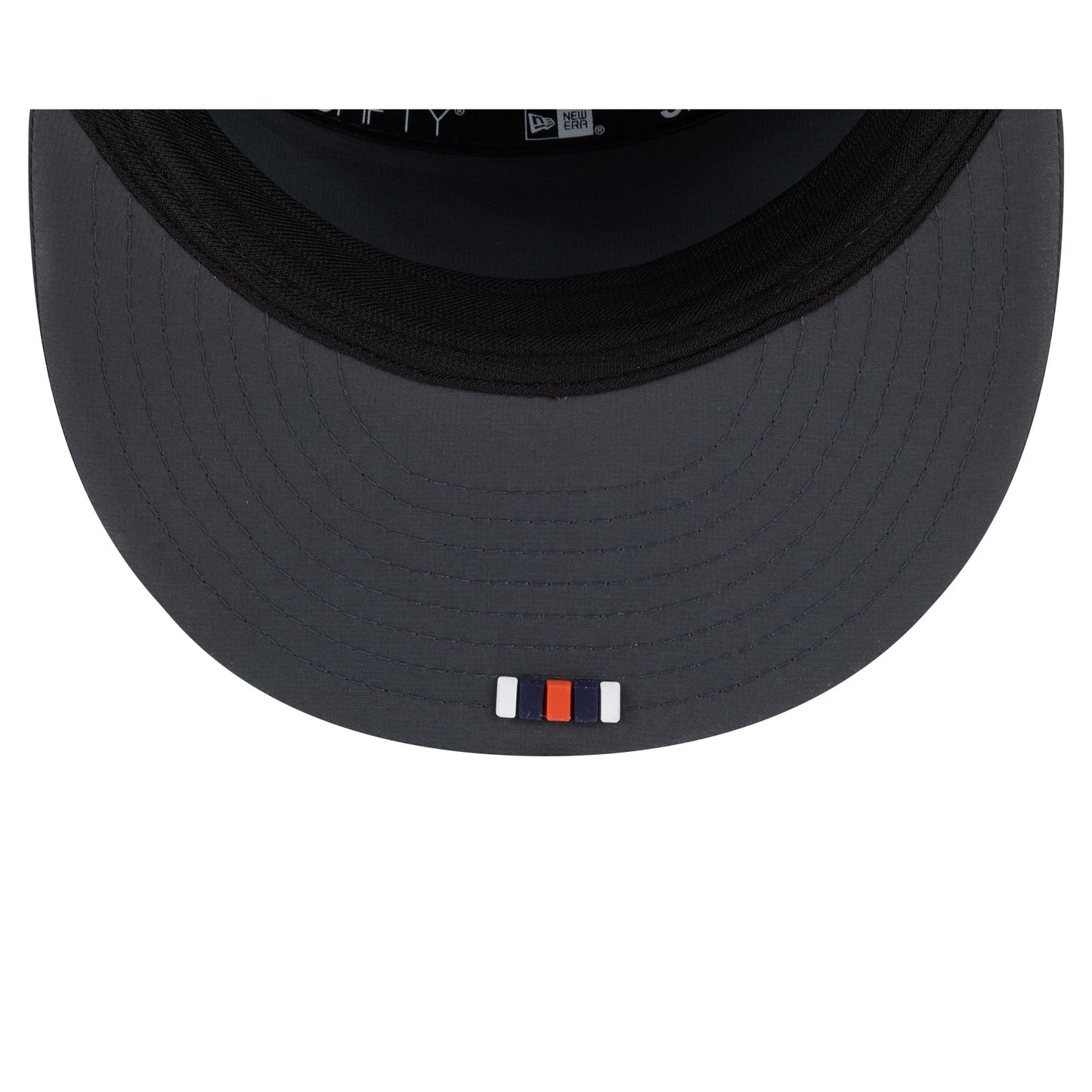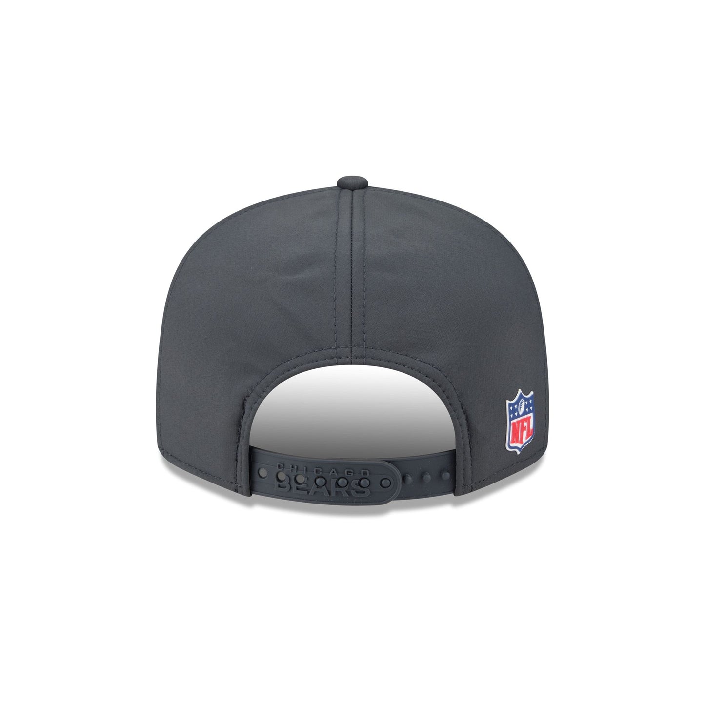 The Chicago Bears 2025 Sideline Cold Weather Steel Clouds Split Panel 9FIFTY Snapback features a sewn-down silicone Bears logo patch at the front panels with a split-crown construction and diamond quilting. The cap has a water-repellent quill tech fabrication throughout, with a quick-dry cushioned sweatband to absorb moisture. Additional details include the Official NFL Shield logo to the right of a soft silicone snapback closure at the rear with eyelets at each side panel. The undervisor is accented with a silicone transfer in the team’s colors.