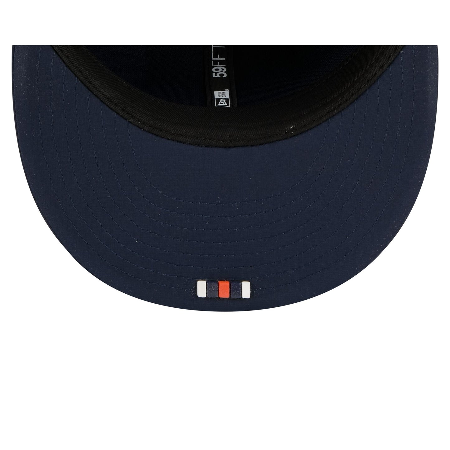 The Chicago Bears 2025 Sideline Hot Weather 59FIFTY Fitted Cap features a sewn-down silicone Bears logo patch at the front panels with the Official NFL Shield logo and George Stanley Halas initials at the rear. The cap has a water-repellent quill tech fabrication throughout, with a quick-dry cushioned sweatband to absorb moisture. The undervisor is accented with a silicone transfer in the team’s colors.