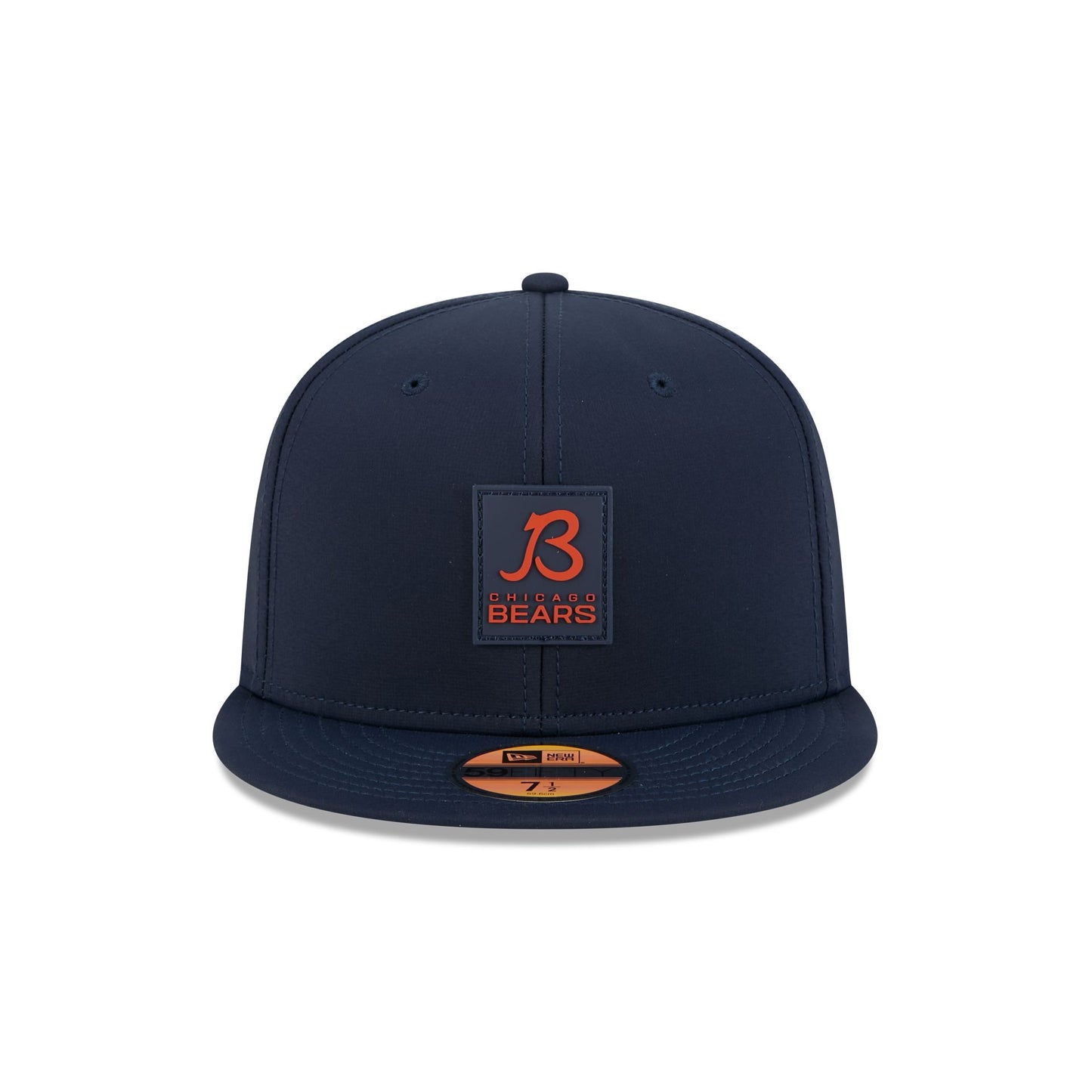 The Chicago Bears 2025 Sideline Hot Weather B 59FIFTY Fitted Cap features a sewn-down silicone Bears logo patch at the front panels with the Official NFL Shield logo and George Stanley Halas initials at the rear. The cap has a water-repellent quill tech fabrication throughout, with a quick-dry cushioned sweatband to absorb moisture. The undervisor is accented with a silicone transfer in the team’s colors.