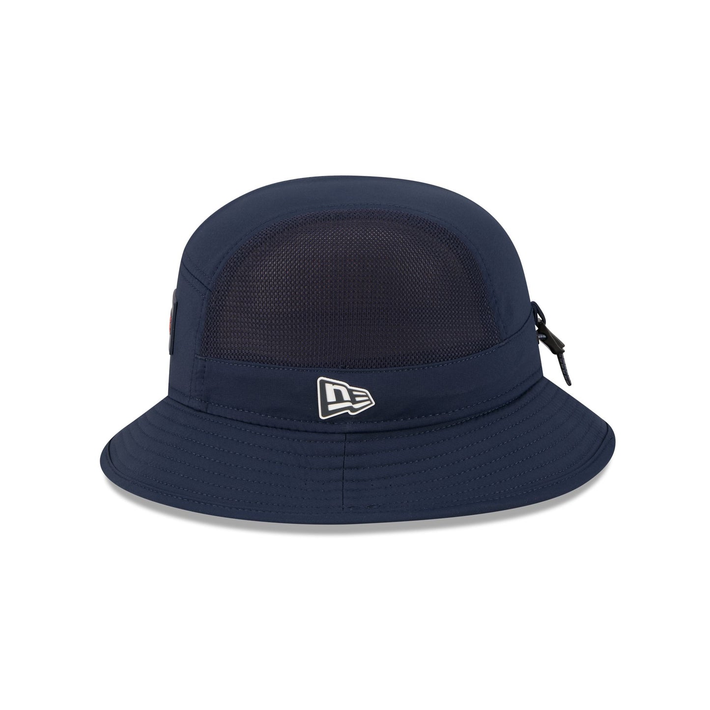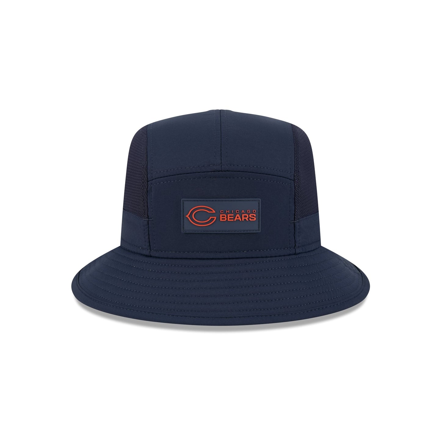 The Chicago Bears 2025 Sideline Hot Weather Bucket Hat features a sewn-down silicone Bears logo patch at the front with the Official NFL Shield logo at the right-wear side. Additional details include breathable mesh side panels and an adjustable reflective drawstring at the rear.