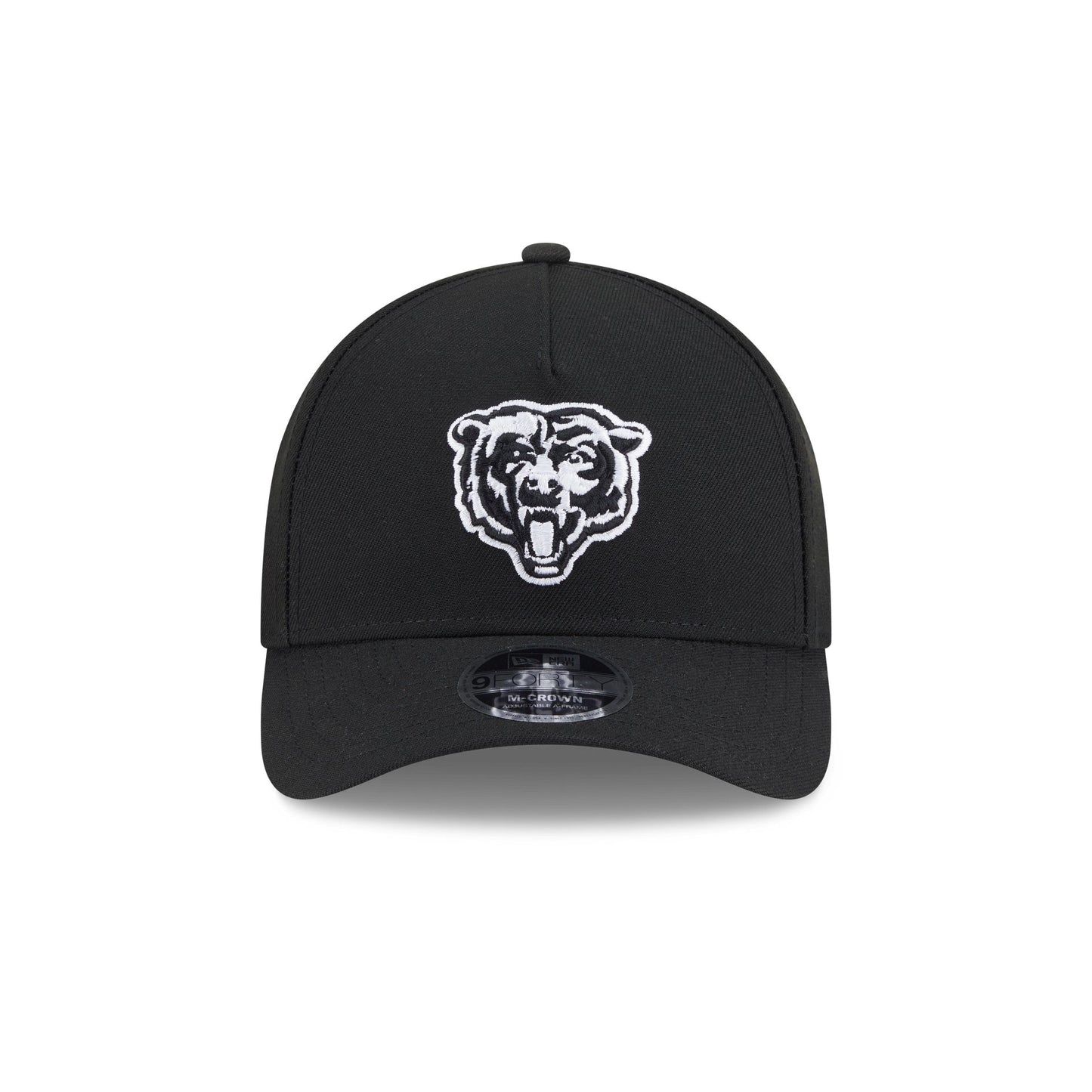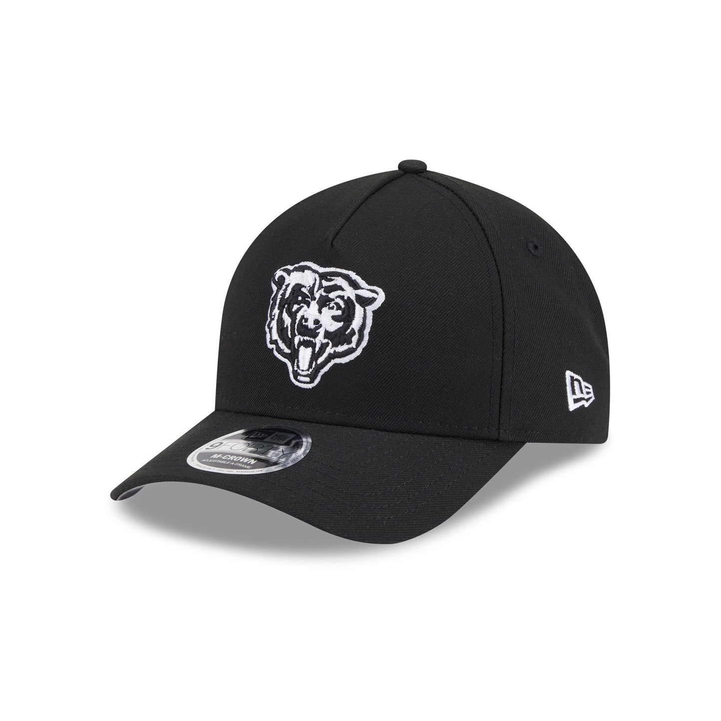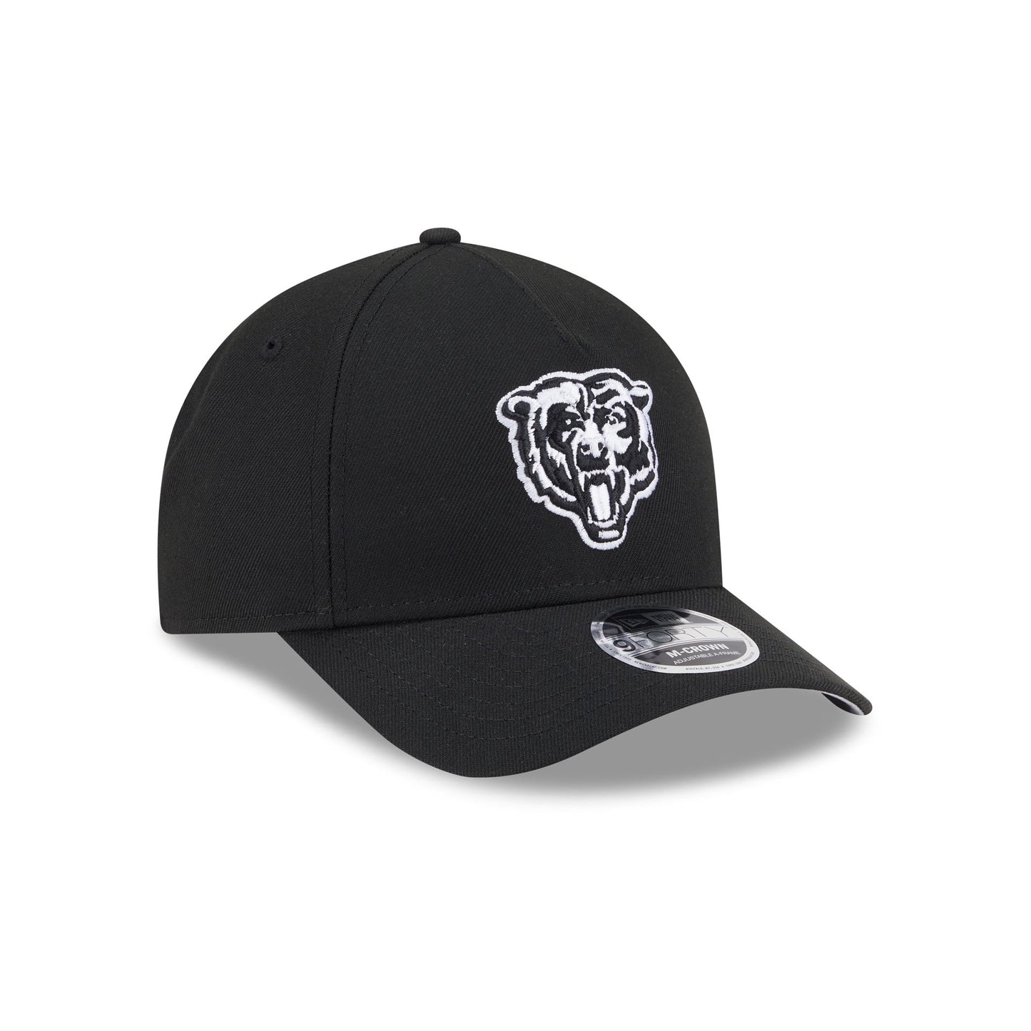 The Chicago Bears Black & White 9FORTY M-Crown A-Frame Snapback features an embroidered Bears logo at the front panels with an adjustable snapback closure at the rear and a gray undervisor.