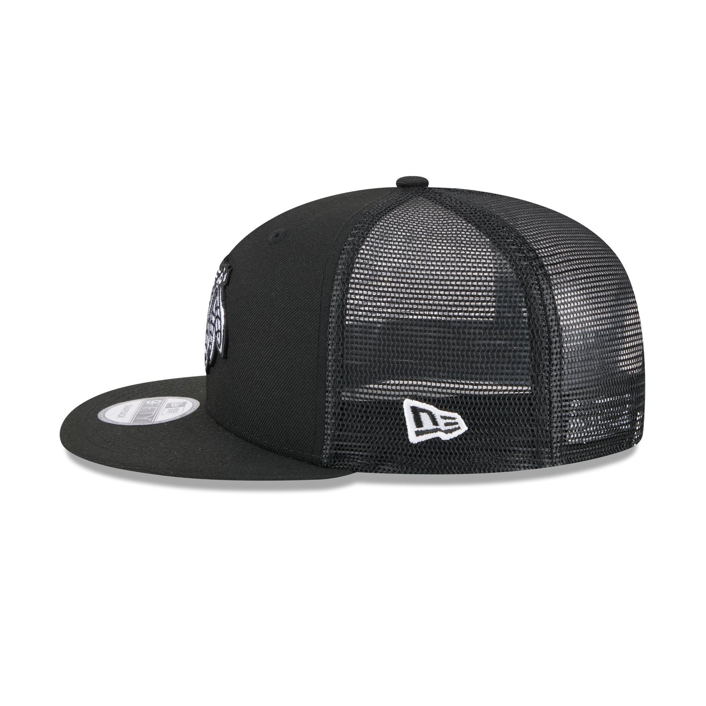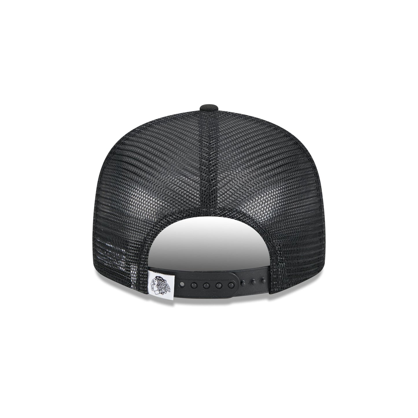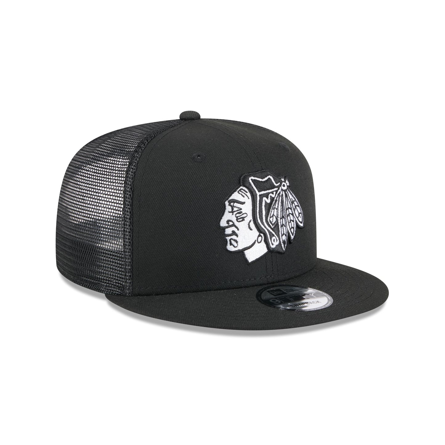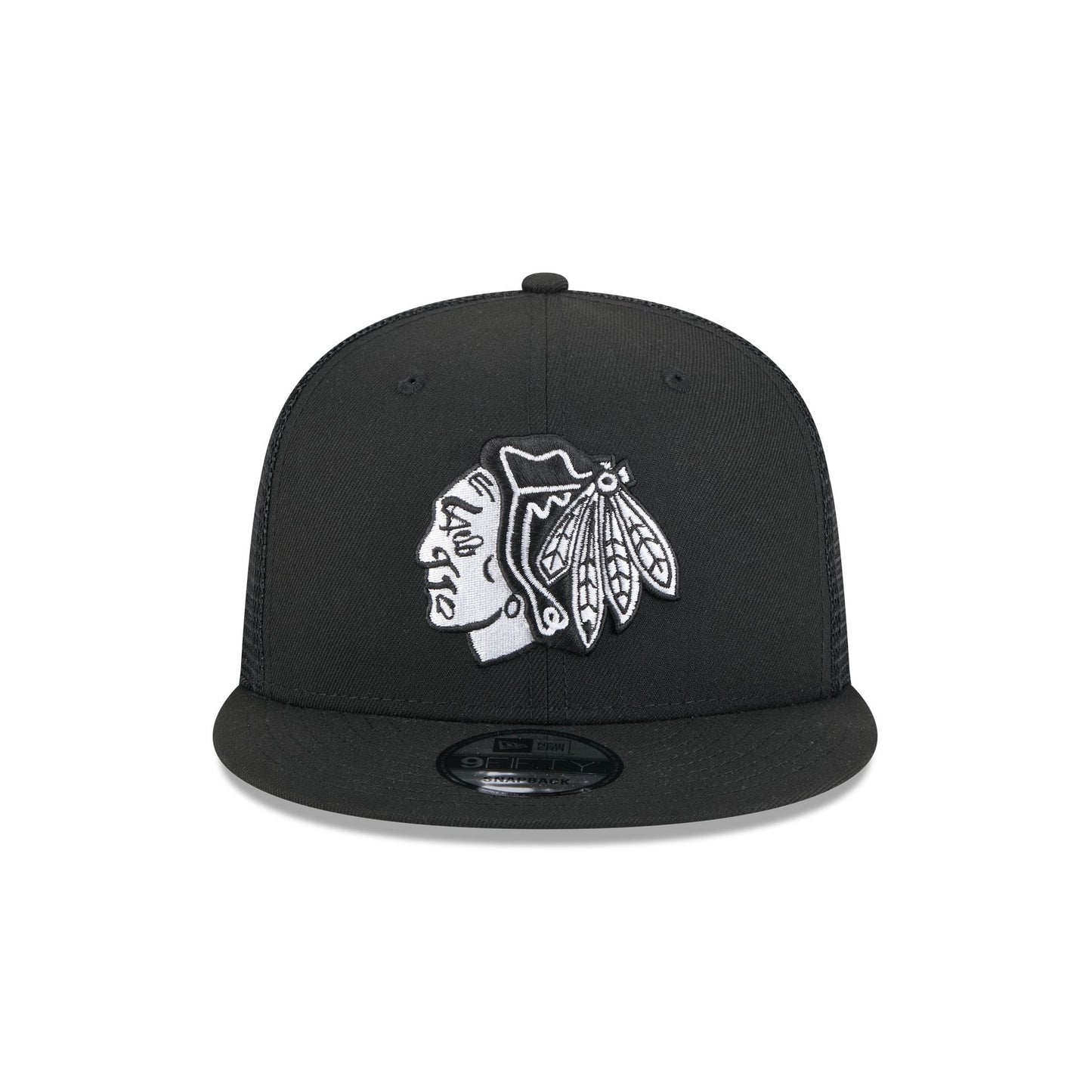 The Chicago Blackhawks Black 9FIFTY Trucker features an embroidered Blackhawks logo at the front panels with a matching woven team tag at a snapback closure at the rear and a gray undervisor.