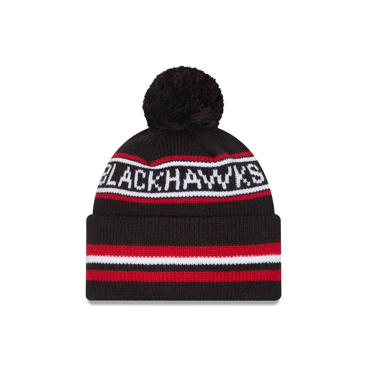 The Chicago Blackhawks Classic Pom Knit Hat features an embroidered Blackhawks logo at the front cuff with a wordmark at the crown and a one-time removable pom.