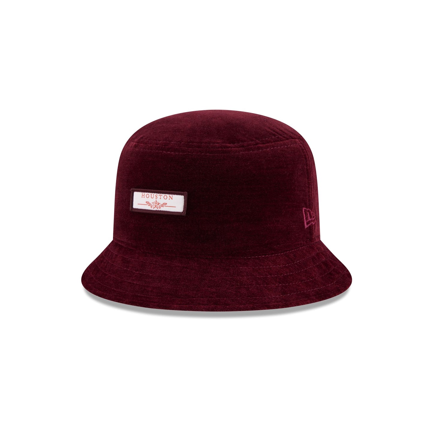 The Chicago Blackhawks Fall Velvet Bucket Hat features a woven Blackhawks tag at the front with a red velvet fabrication throughout.
