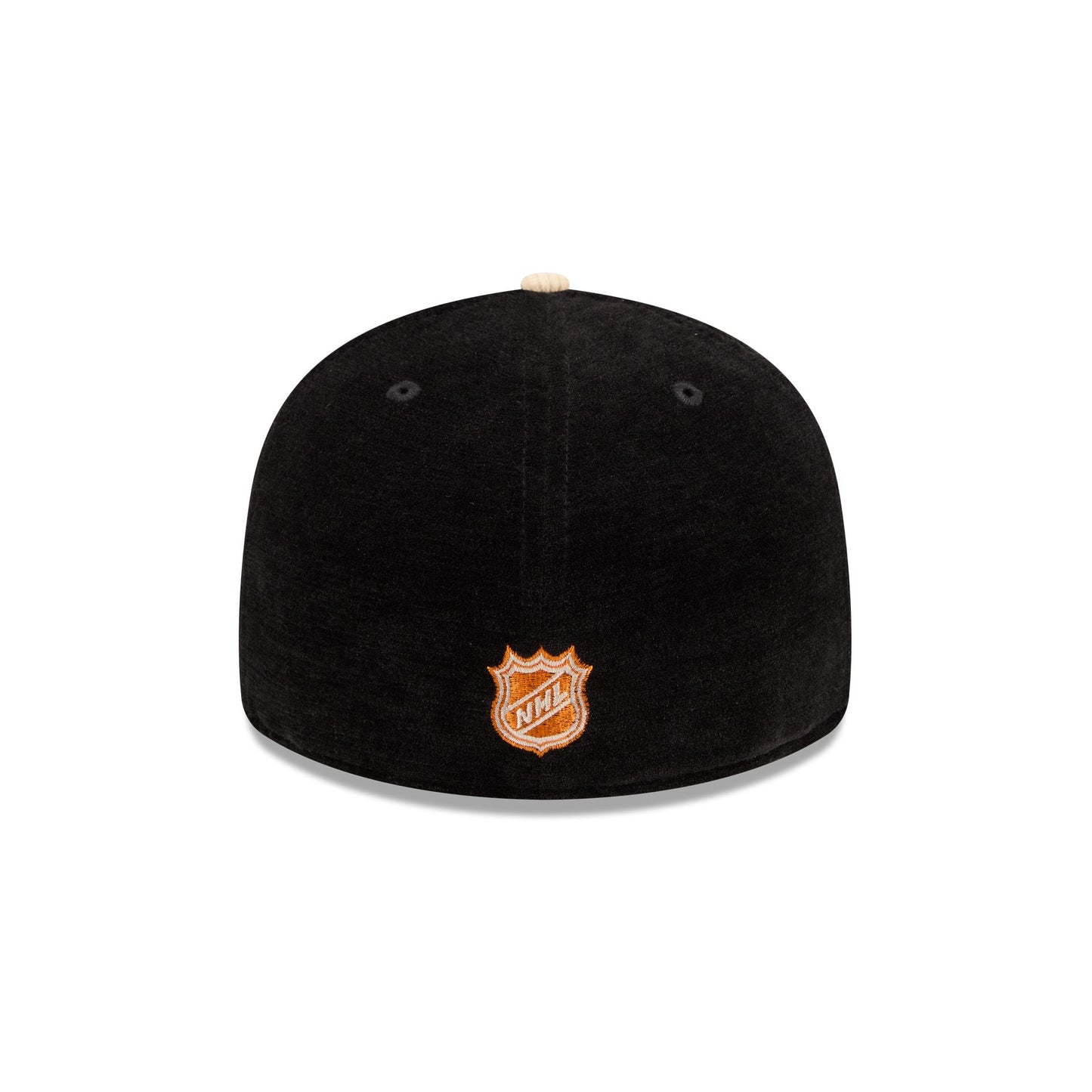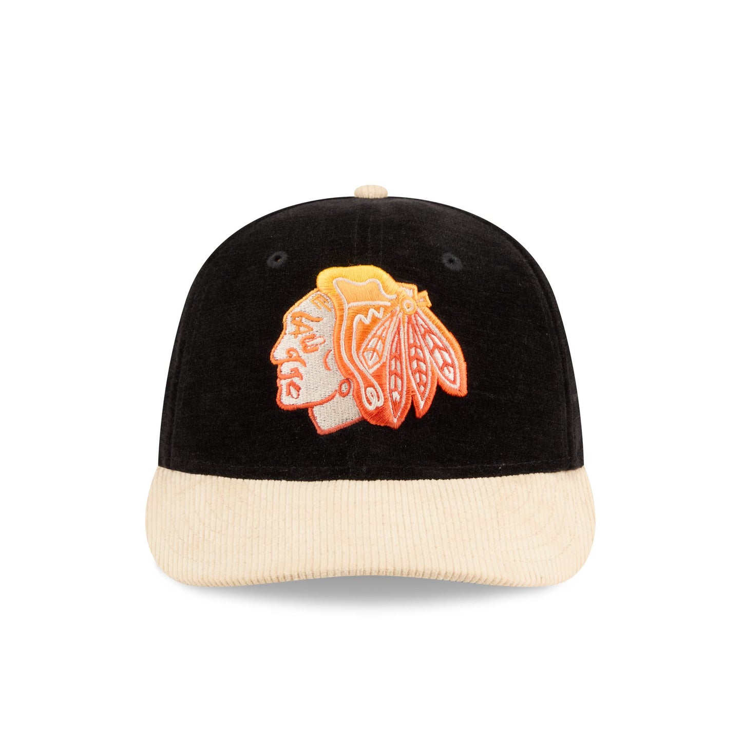 The Chicago Blackhawks Fall Velvet Low Profile 59FIFTY Fitted Cap features an embroidered Blackhawks fall gradient logo at the front panels against a velvet fabrication throughout. Additional details include an antique brass leather stitch down city plate at the right-wear side, a matching NHL Shield logo at the rear, and a green undervisor.