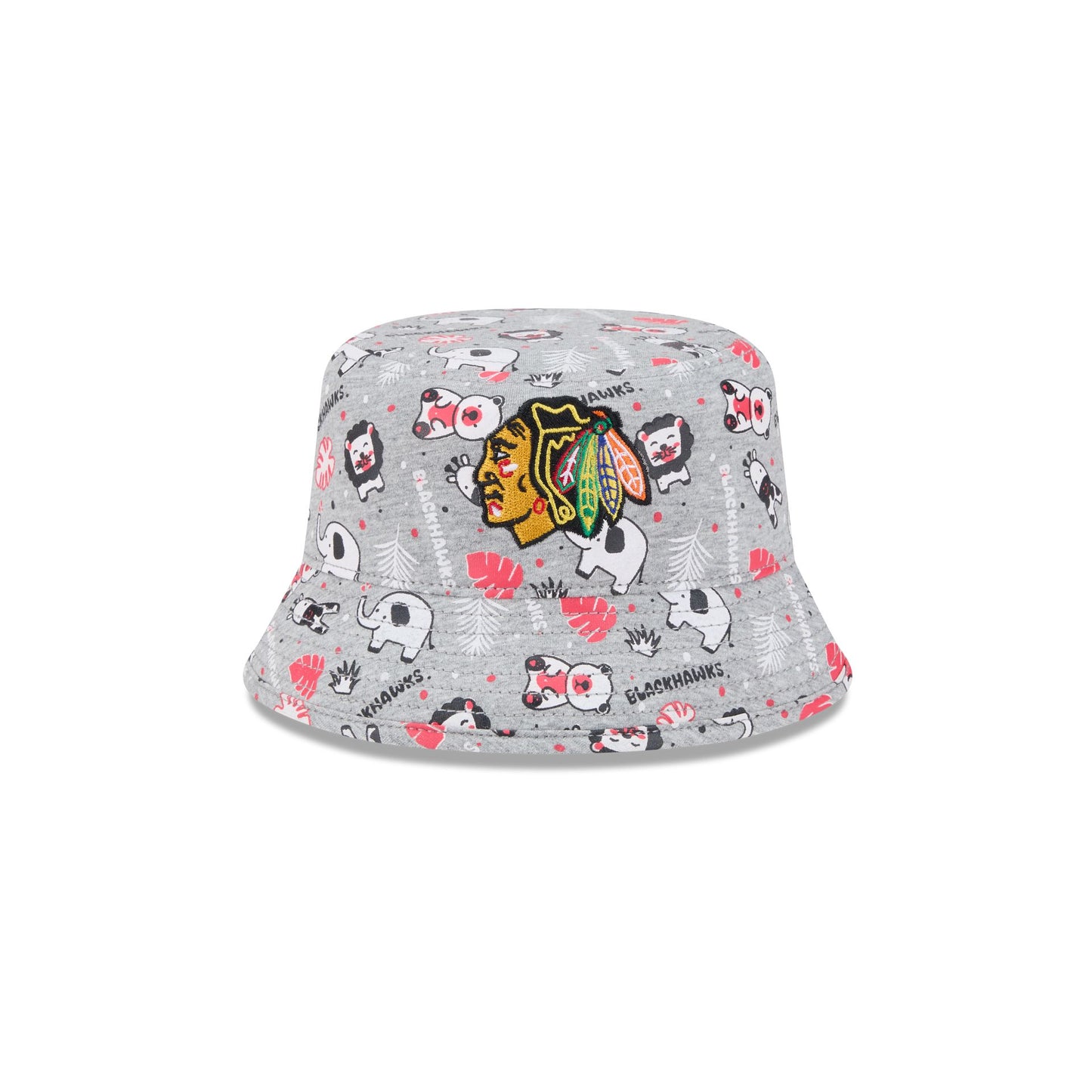 The Chicago Blackhawks Kids Animal Bucket Hat features an embroidered Blackhawks logo at the front with screen-printed animals throughout.