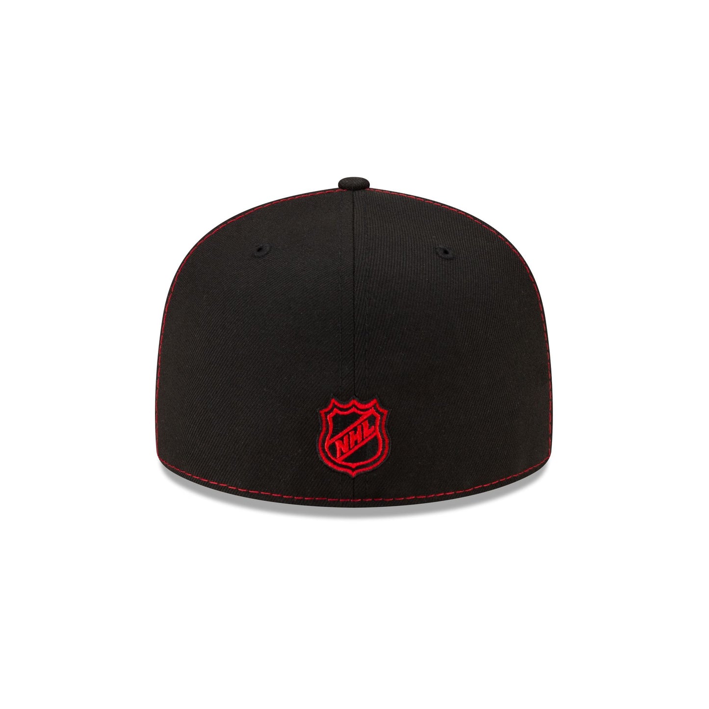 The Chicago Blackhawks Mascot 59FIFTY Fitted Cap features an embroidered Blackhawks mascot at the front panels with team color paneled crown and a gray undervisor. Additional details include a team logo at the right-wear side with a matching NHL Shield at the rear.