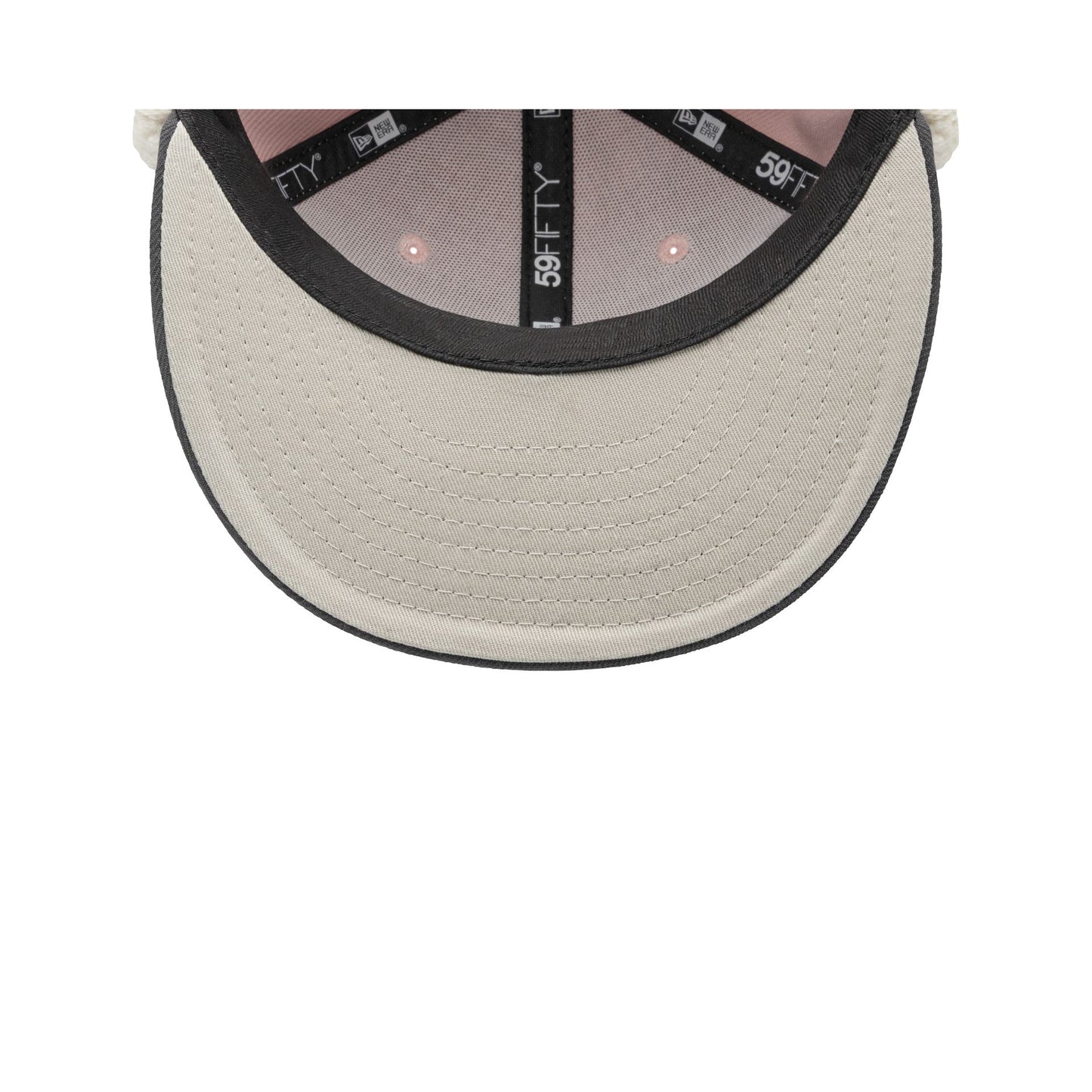 The Chicago Blackhawks Patches Pink Dog Ear 59FIFTY Fitted Cap features an embroidered Blackhawks logo at the front panels with a matching NHL Shield at the rear, a chrome undervisor, and a hook and loop closure. Additional details include team patches throughout the left and right wear sides with sherpa lined ear covers and an NHL Shield at the interior.