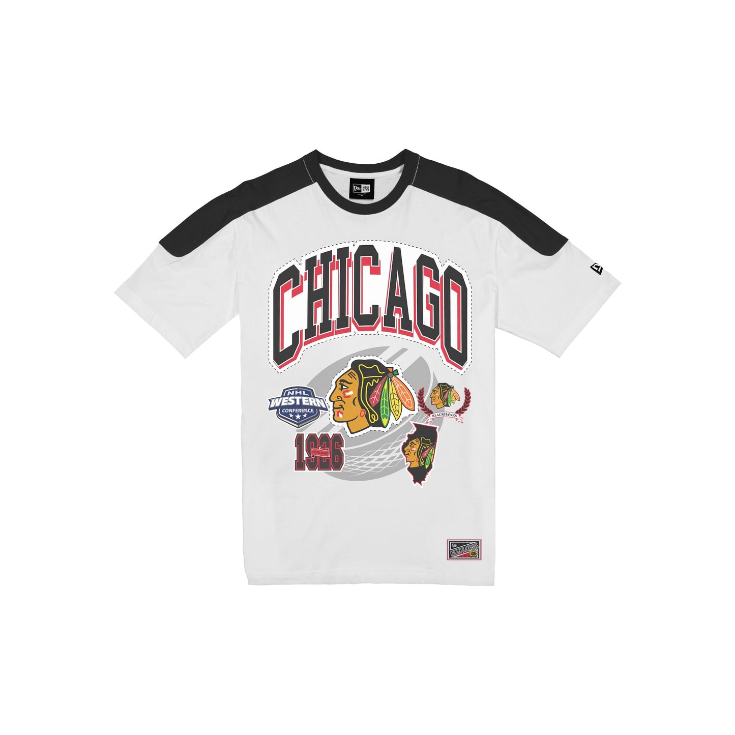 The Chicago Blackhawks Sport Classics Vintage White Oversized T-Shirt features a screen-printed Blackhawks wordmark and graphic at the front with woven team jocktag at the bottom hem and a team color stripe at the shoulders.