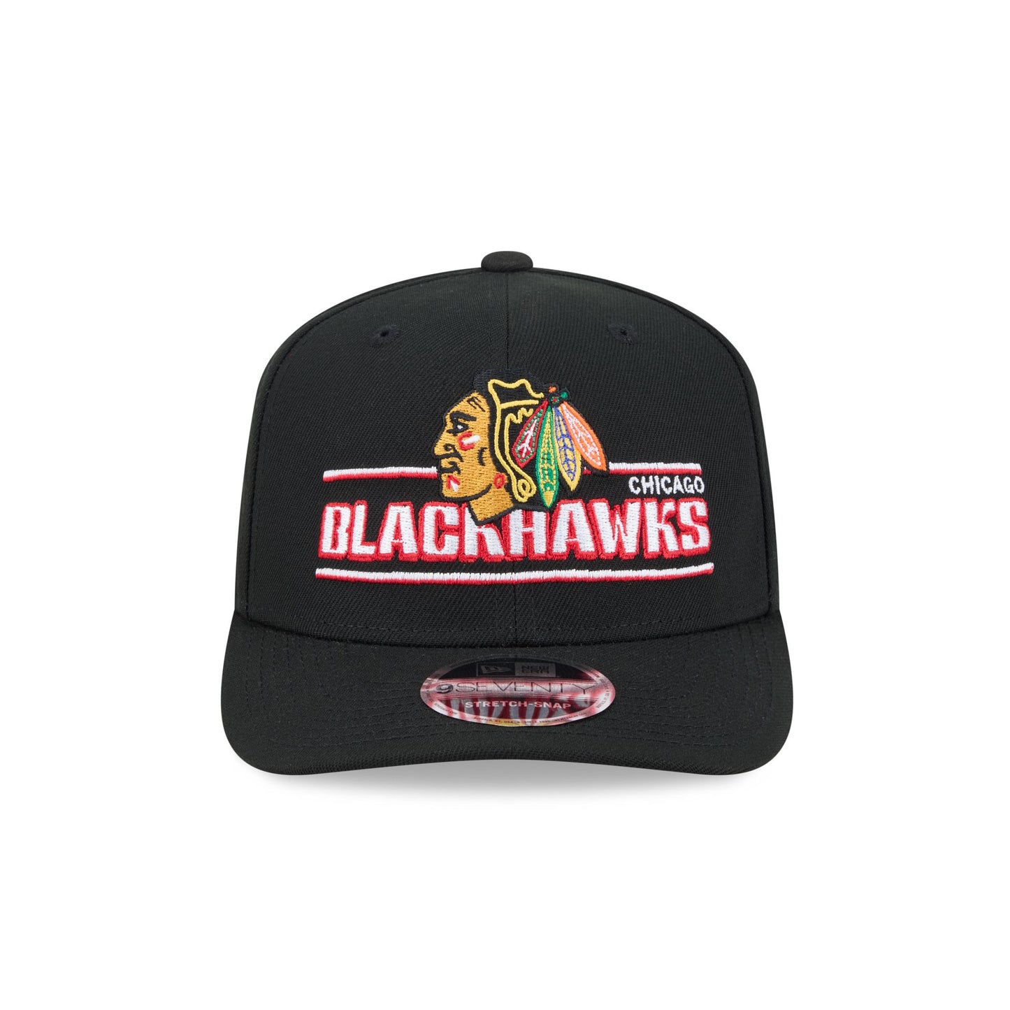 The Chicago Blackhawks Stated 9SEVENTY Stretch-Snap features an embroidered Blackhawks graphic a the front panels with an adjustable stretch-snap closure at the rear and a gray undervisor.