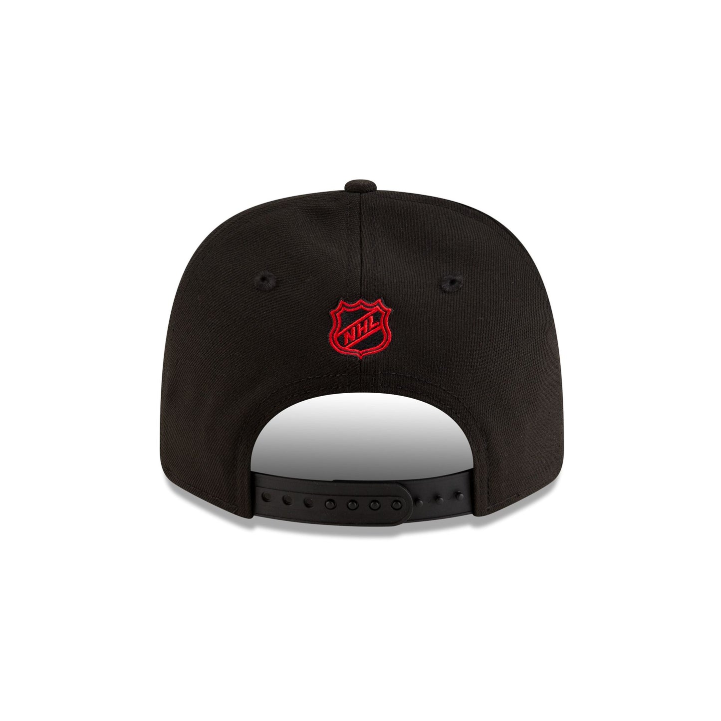 The Chicago Blackhawks Team Black 9SEVENTY Stretch-Snap Cap features an embroidered Blackhawks logo at the front panels with the NHL Shield logo above an adjustable stretch-snap closure at the rear and a gray undervisor.
