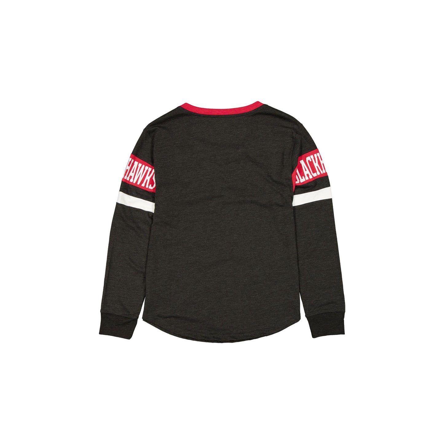 The Chicago Blackhawks Throwback Women's V-Neck Long-Sleeve T-Shirt features an embroidered Blackhawks logo at the left chest with ties at a v-neckline with varsity stripes and wordmarks at each arm.