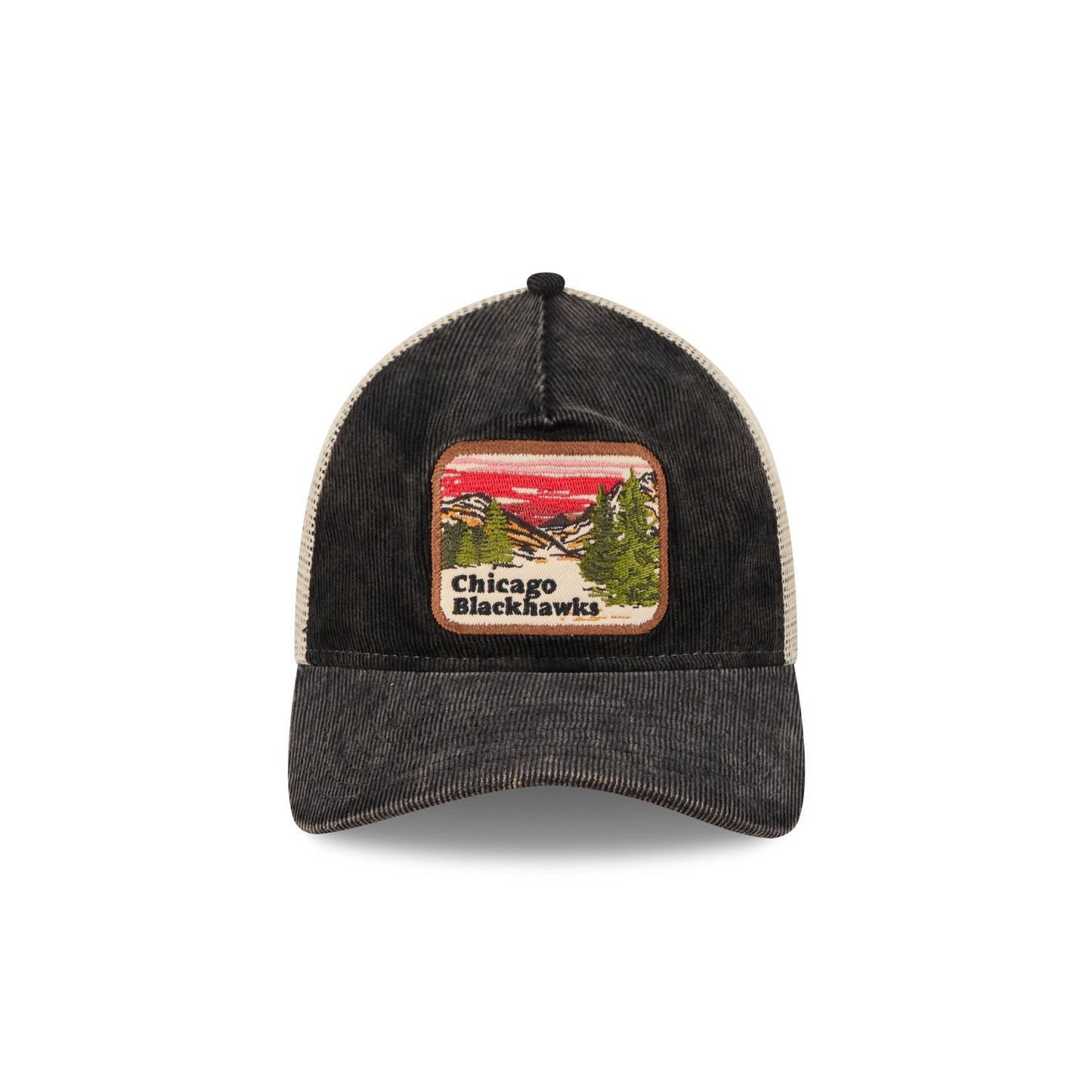 The Chicago Blackhawks Vintage Landscape 9TWENTY A-Frame Trucker features an embroidered Blackhawks Vintage Landscape patch at the front panels with a team logo at the right-wear side. Additional details include an adjustable snapback closure at the rear and a gray undervisor.