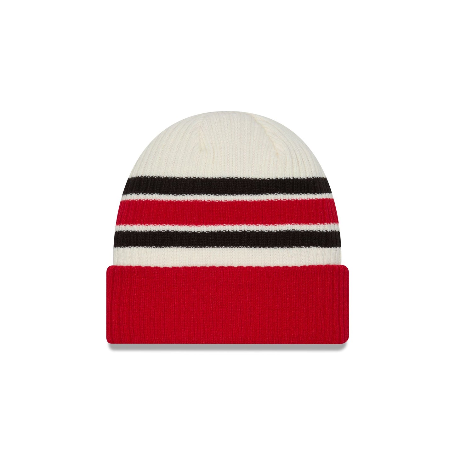 The Chicago Blackhawks Vintage Ribbed Beanie features an embroidered Blackhawks logo at the front cuff and stripes at the crown.