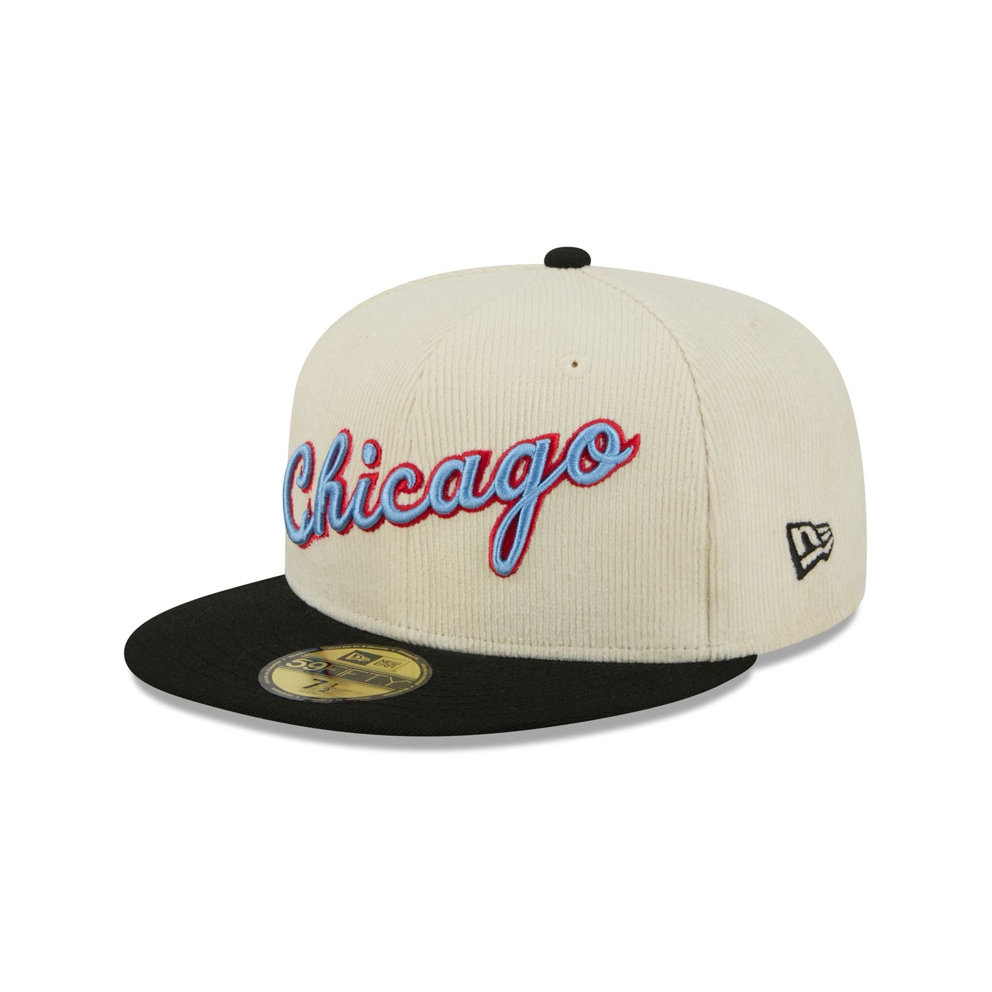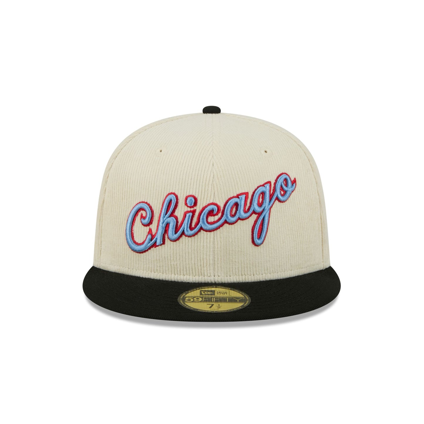 The Chicago Bulls 2025 City Edition Chrome White Corduroy 59FIFTY Fitted Cap features an embroidered Bulls City Edition logo at the front panels with a City Edition jock tag stitched at the right-wear side. Additional details include a corduroy fabrication, the NBA Logoman at the rear, and a gray undervisor.
