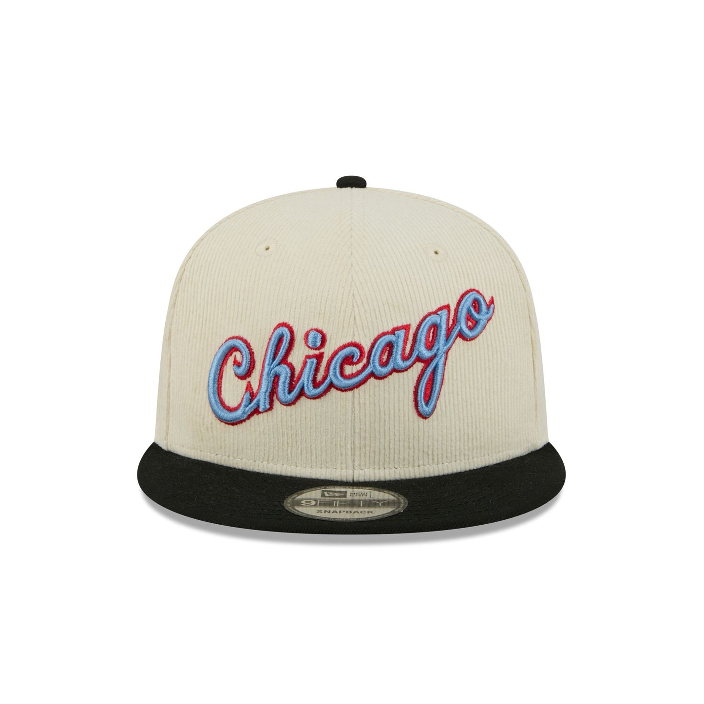 The Chicago Bulls 2025 City Edition Chrome White Corduroy 9FIFTY Snapback features an embroidered Bulls City Edition logo at the front panels with a City Edition jock tag stitched at the right-wear side. Additional details include a corduroy fabrication, the NBA Logoman above an adjustable snapback closure at the rear, and a gray undervisor.