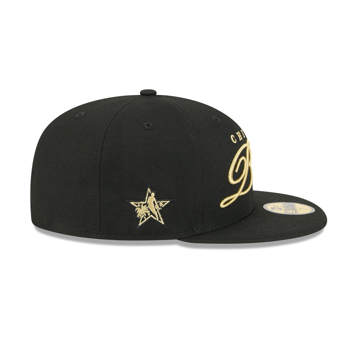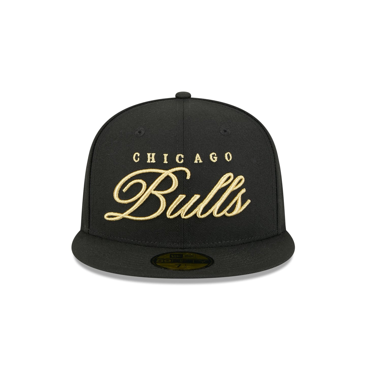 The Chicago Bulls 2026 All-Star Game Script Shine 59FIFTY Fitted Cap features an embroidered Bulls gold script at the front panels with the NBA All-Star Game logo at the right-wear side. Additional details include the NBA Logoman at the rear and a gray undervisor.