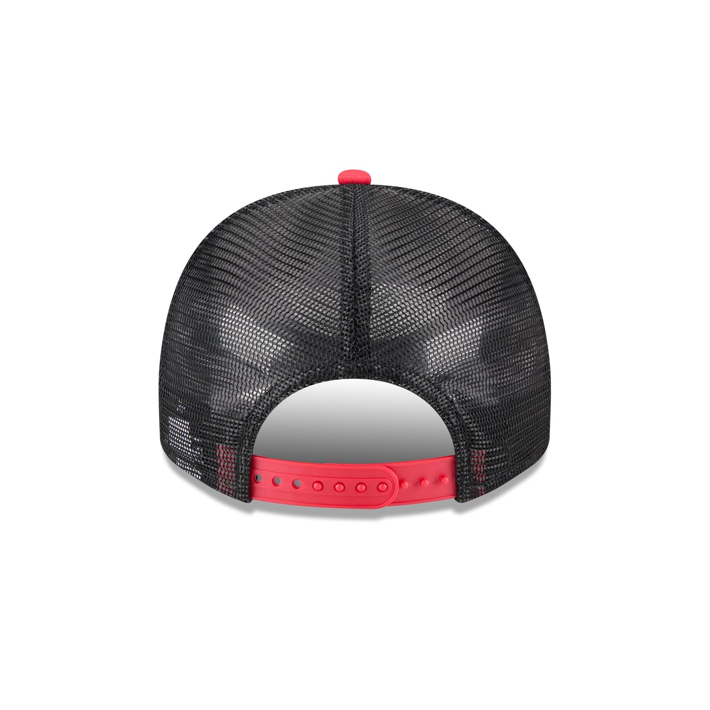 The Chicago Bulls Banner 9FIFTY A-Frame Trucker features a embroidered Bulls logo at the front panels against a screen-printed stripe at the front panels. Additional details include a snapback closure at a mesh rear and a gray undervisor.