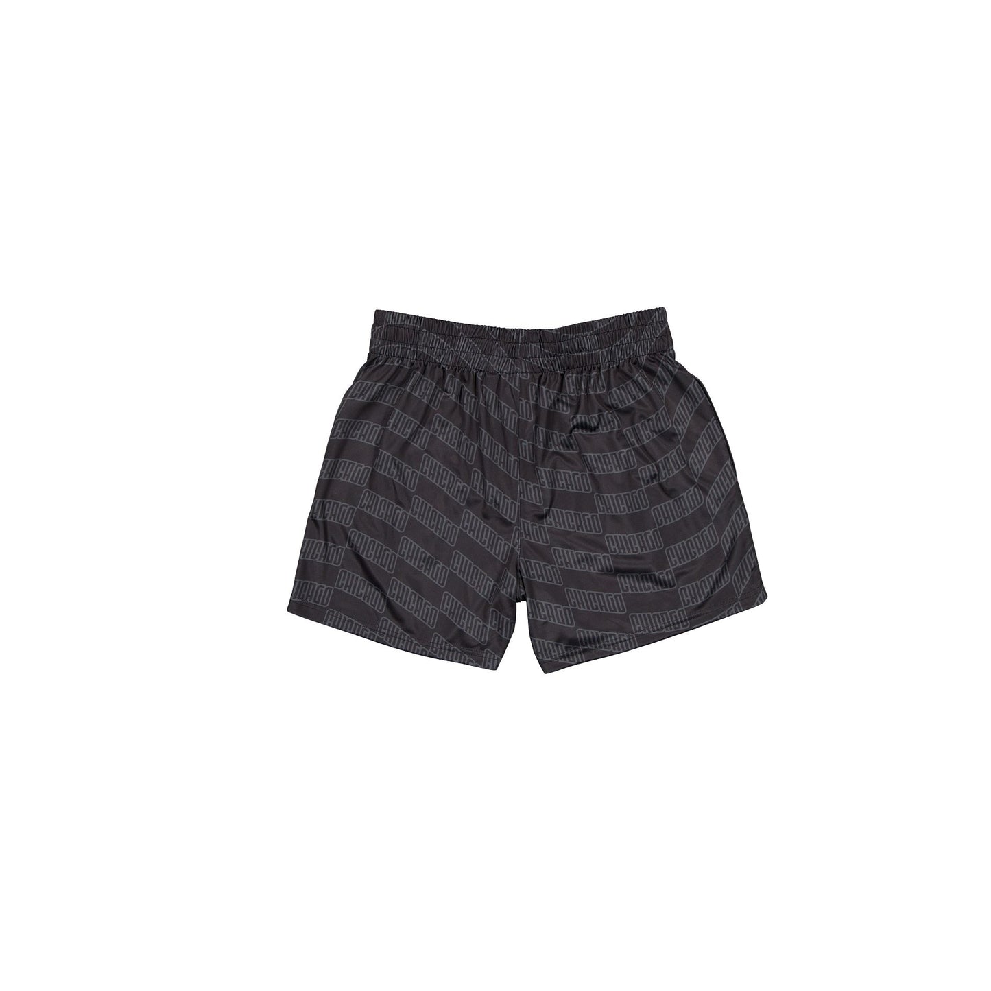 The Chicago Bulls Black All-Over-Print Shorts feature a screen-printed Bulls logo at the right leg with pockets and adjustable drawstrings.