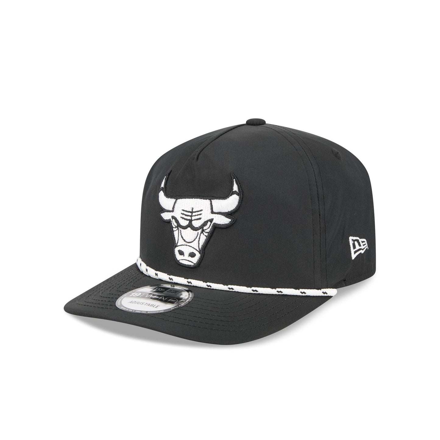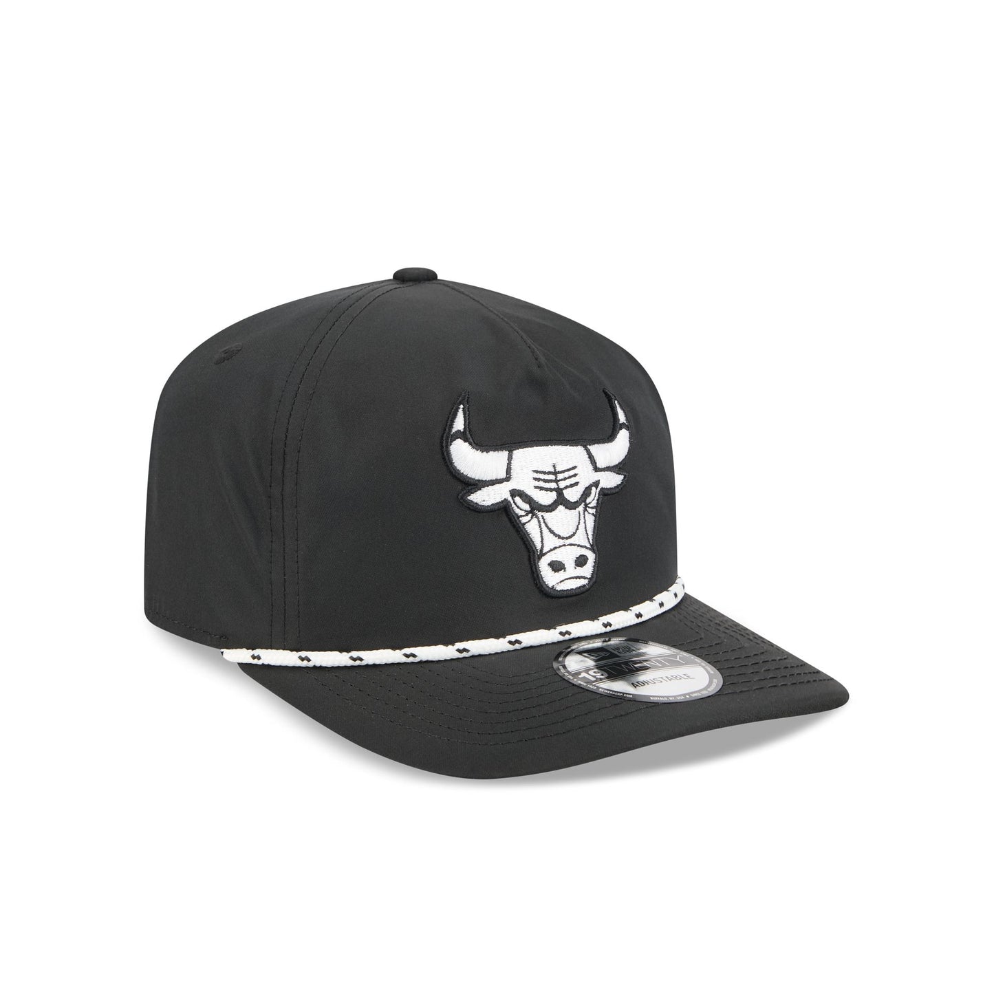 The Chicago Bulls Black and White Rope 19TWENTY Snapback features an embroidered Bulls logo and rope at the front with a snapback closure at the rear and a gray undervisor.