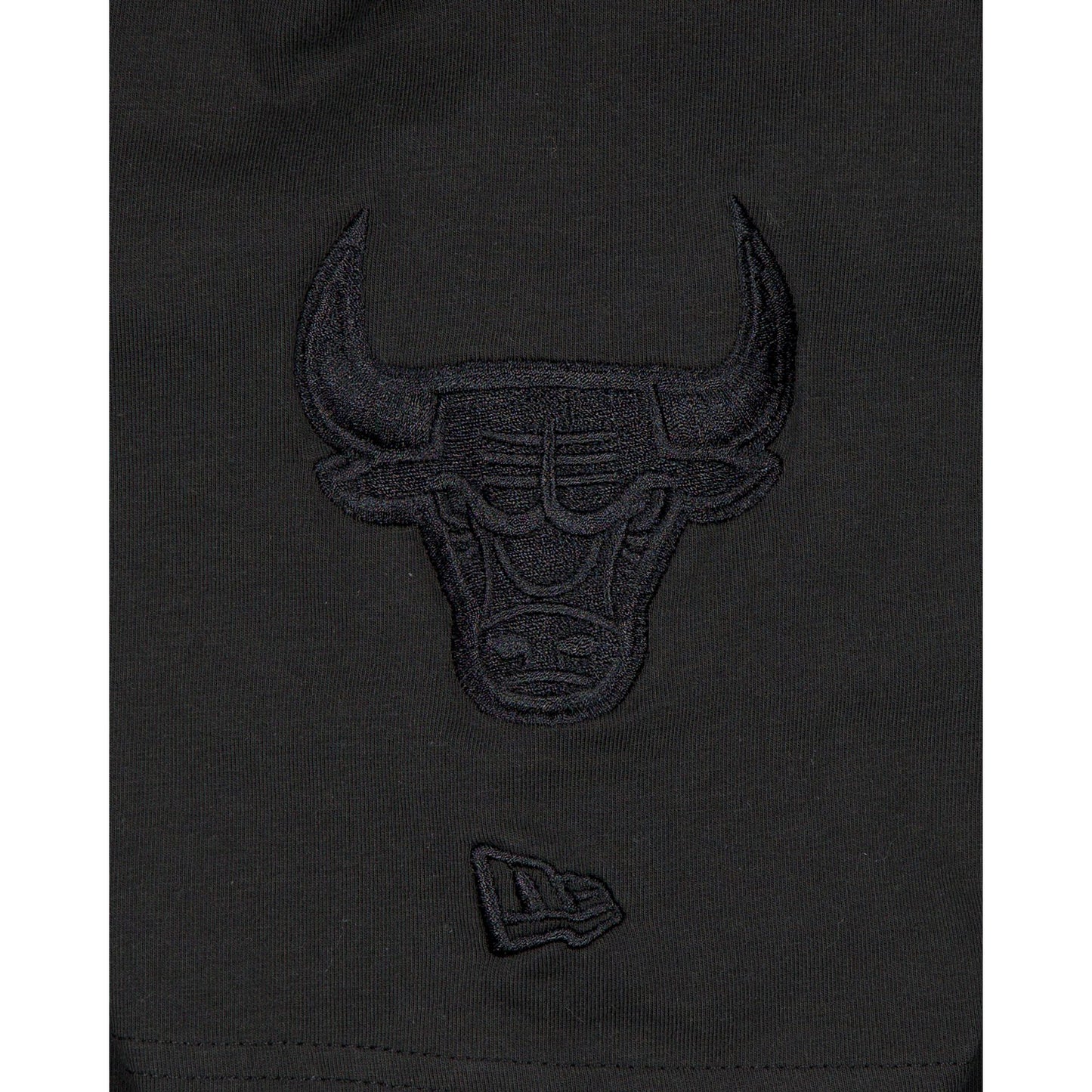 The Chicago Bulls Black on Black Logo Select T-Shirt features a satin applique with a tonal stitch Bulls wordmark at the chest and an embroidered team logo at the left-wear sleeve.