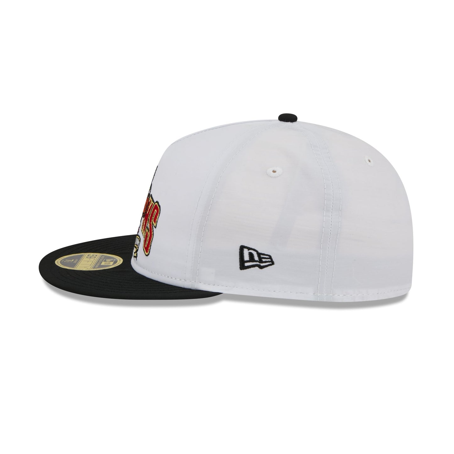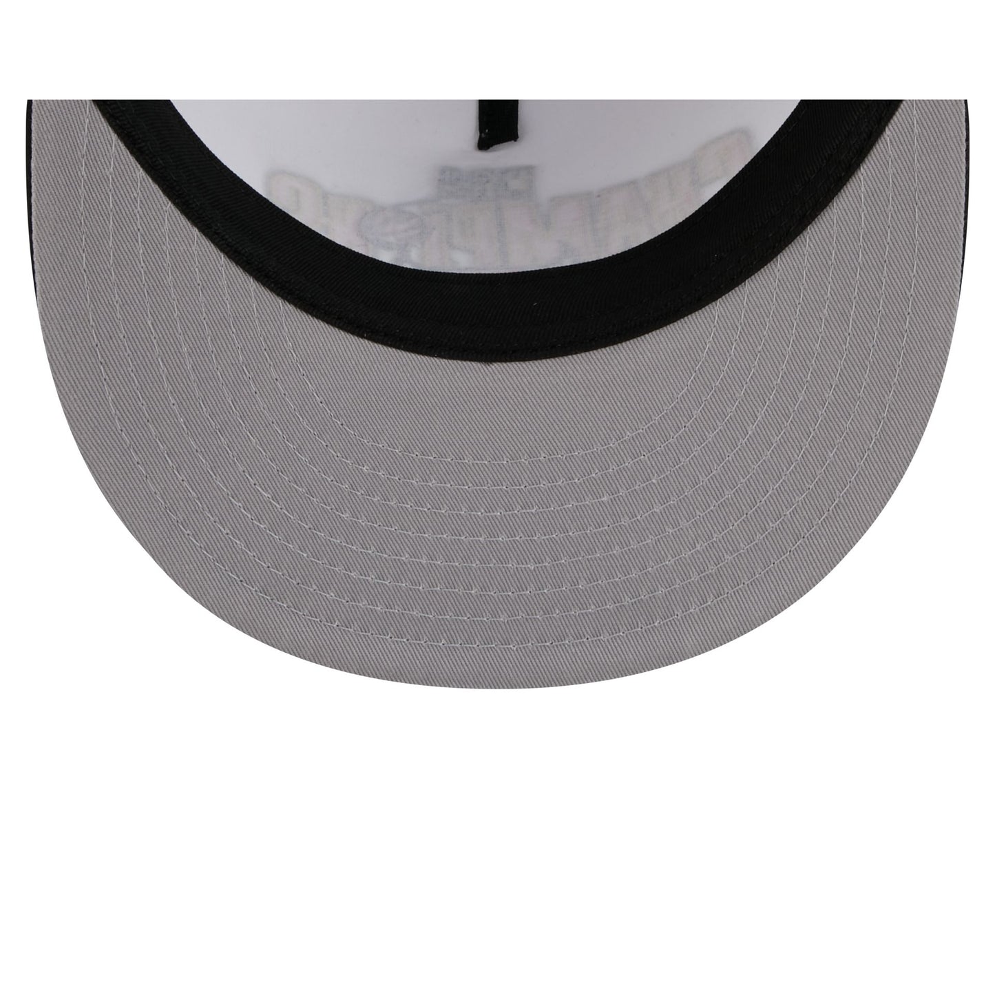 The Chicago Bulls Champions White Retro Crown 59FIFTY Fitted Cap features an embroidered Bulls Champions graphic at the front panels with the NBA Logoman at the rear and a gray undervisor.