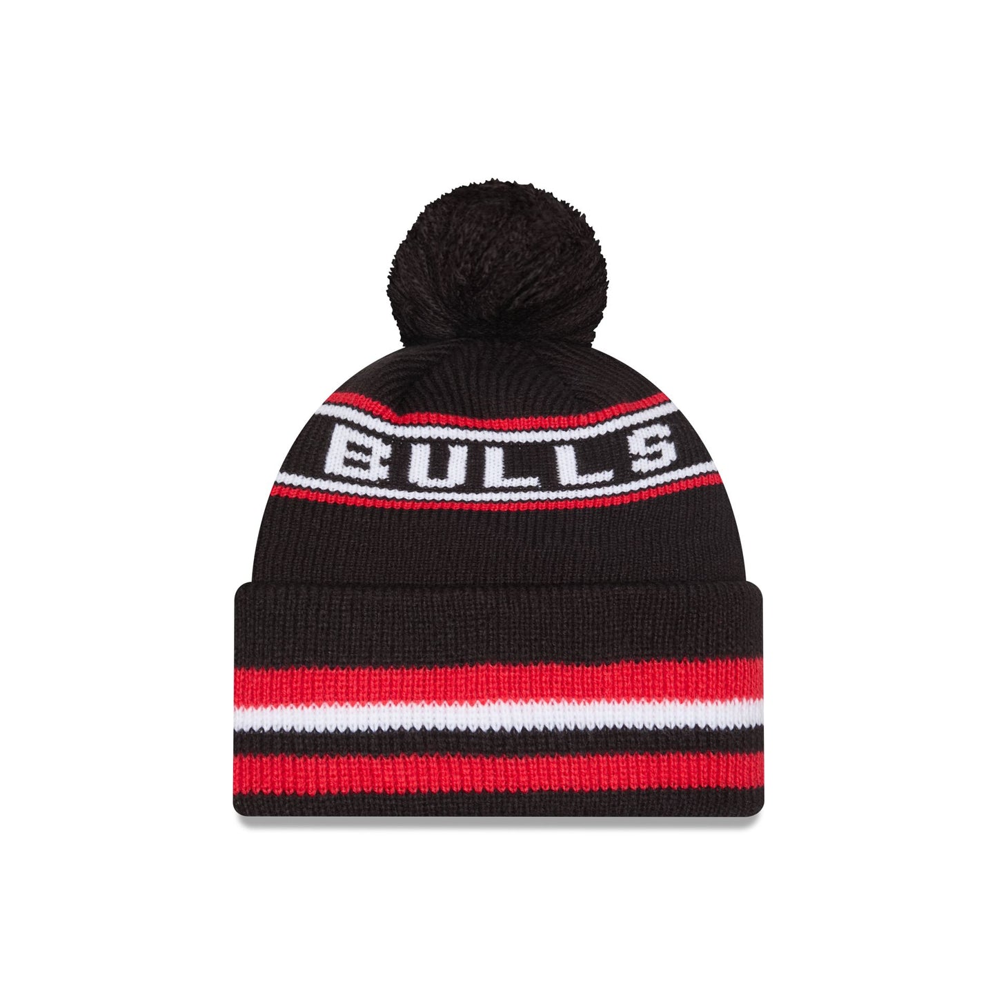 The Chicago Bulls Classic Pom Knit Hat features an embroidered Bulls logo at the front cuff with a wordmark at the crown and a one-time removable pom.