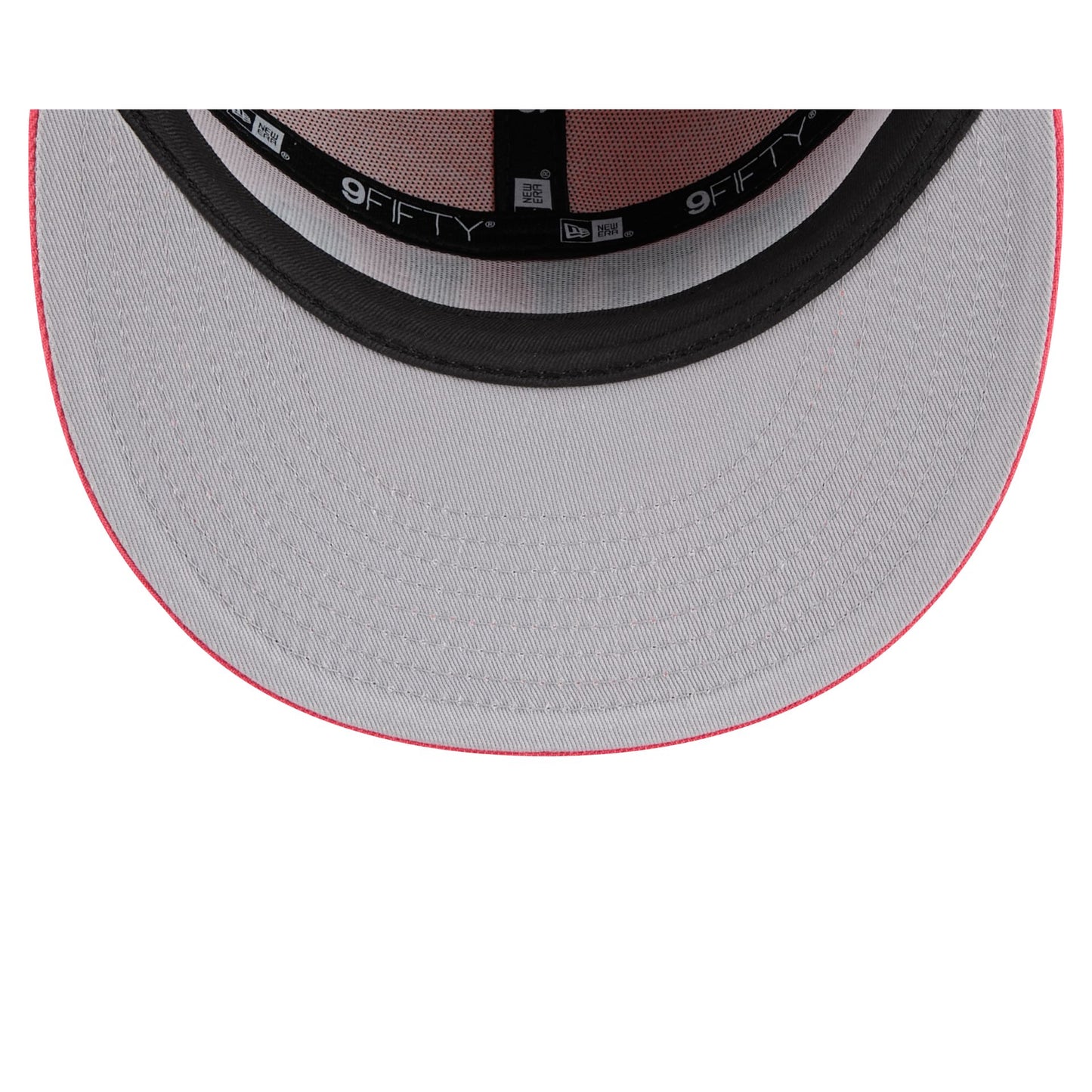 The Chicago Bulls Coral 9FIFTY Split Panel Snapback features an embroidered Bulls wordmark at the front panels with a snapback closure at the rear, a multicolored crown, and a gray undervisor.