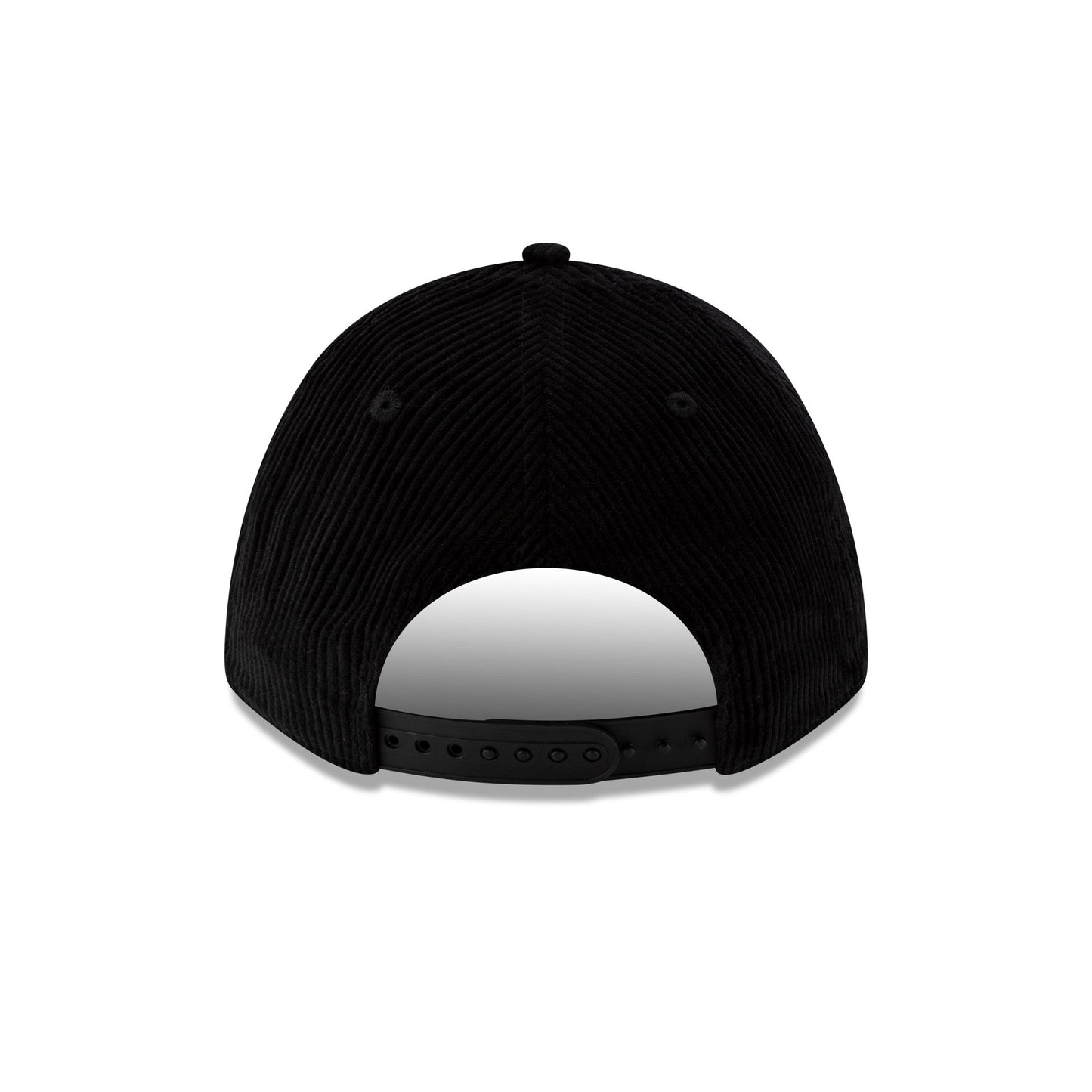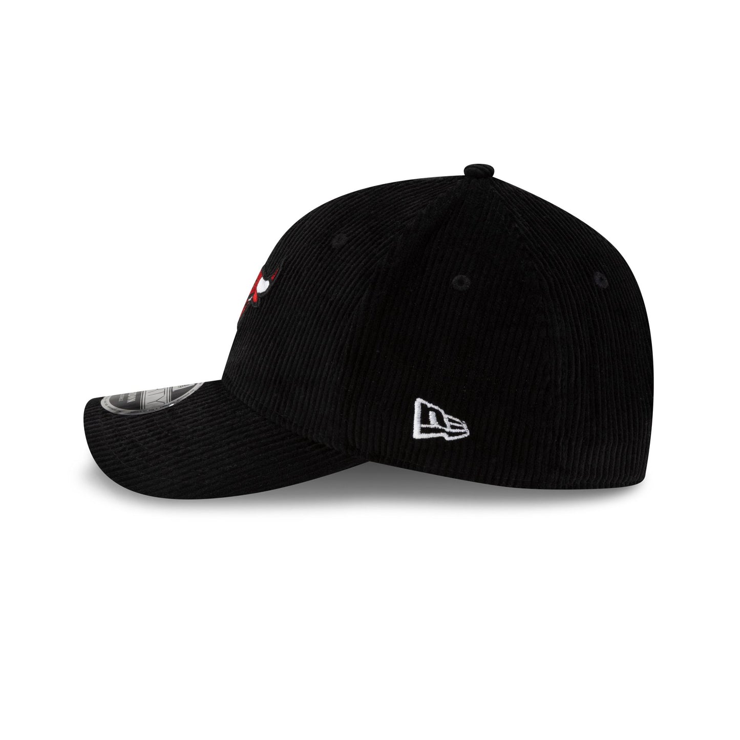 The Chicago Bulls Cord 9FORTY M-Crown Snapback features an embroidered Bulls logo at the front panels with a matching MLB Batterman logo above a snapback closure at the rear and a black undervisor.