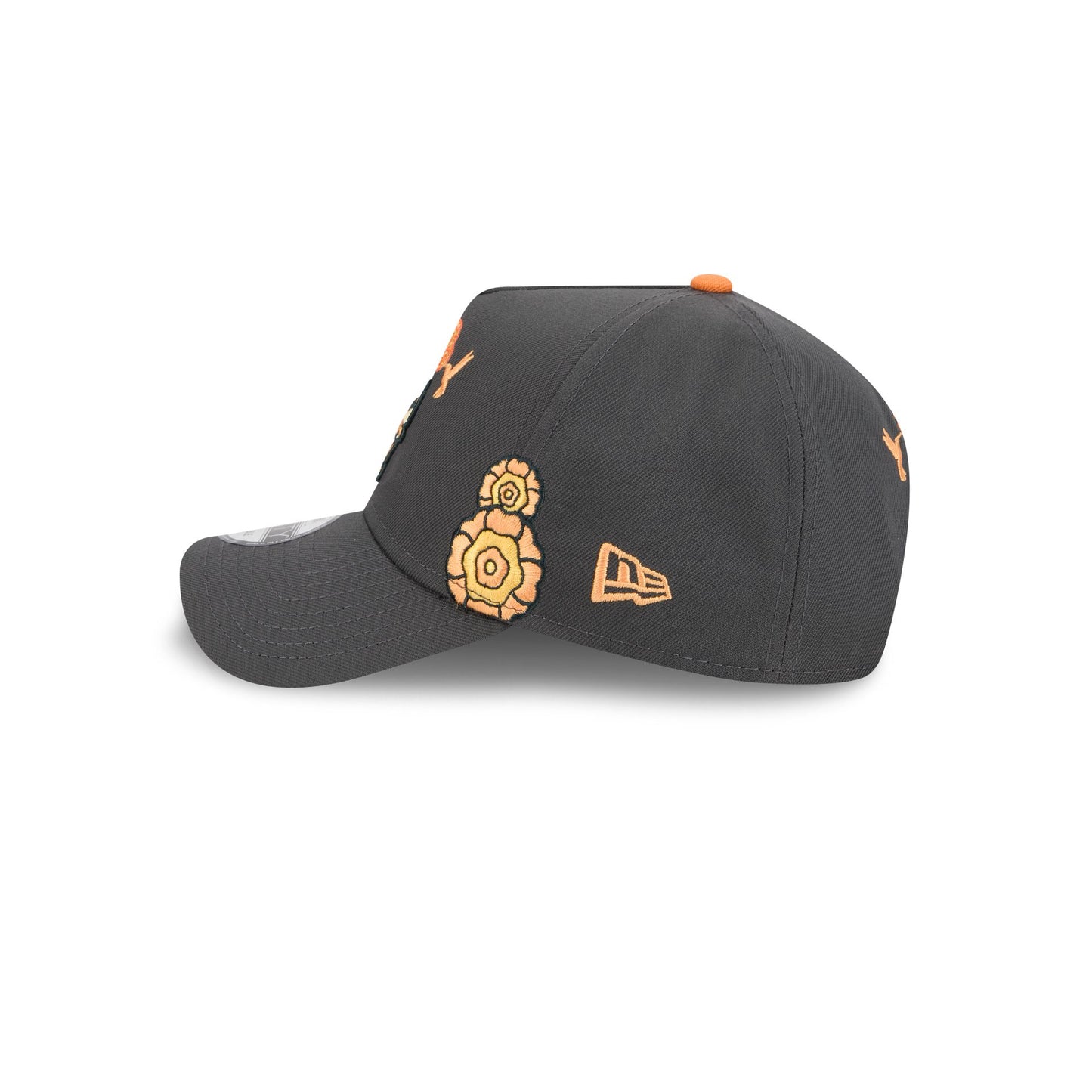 The Chicago Bulls Day of the Dead Graphite 9FORTY A-Frame Snapback features an embroidered Bulls logo at the front panels with marigold (cempasúchil) and hummingbird designs throughout, representing the Legend of Xóchitl and Huitzilin. Additional details include a team patch at the right-wear side and an adjustable snapback closure at the rear.