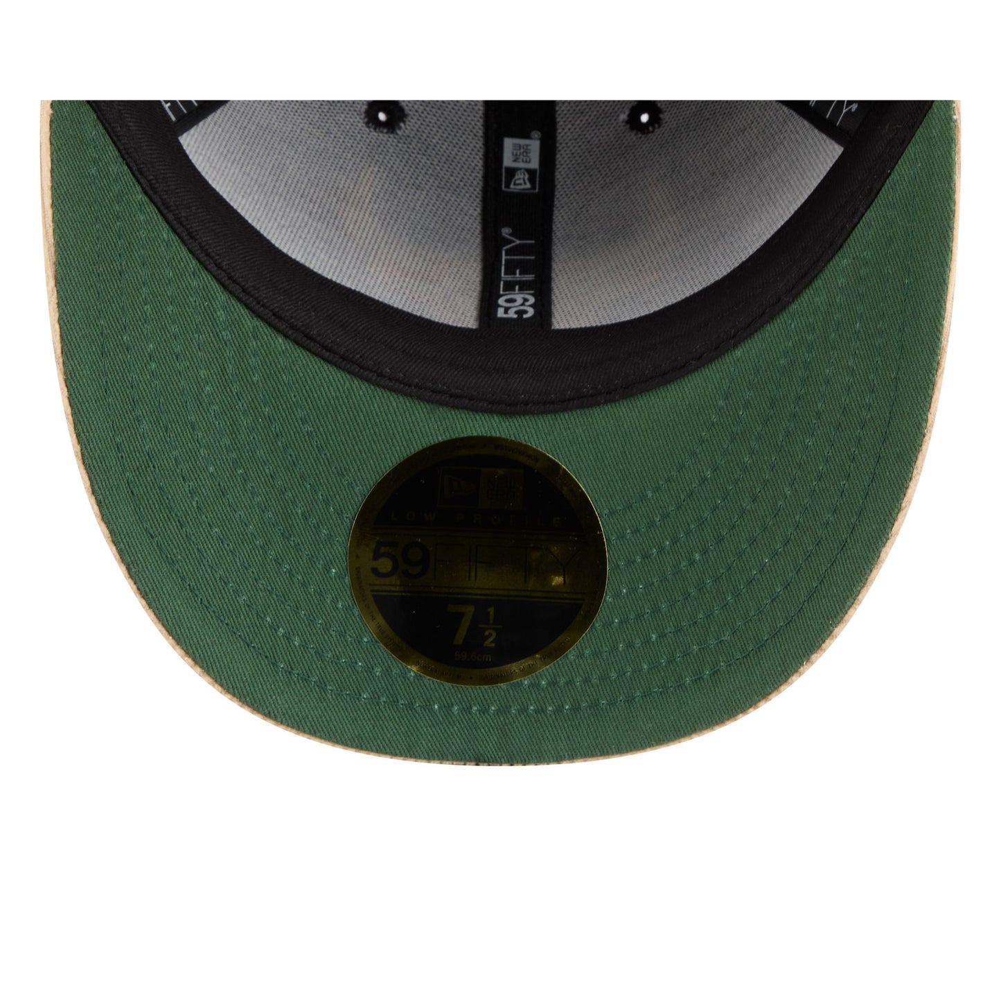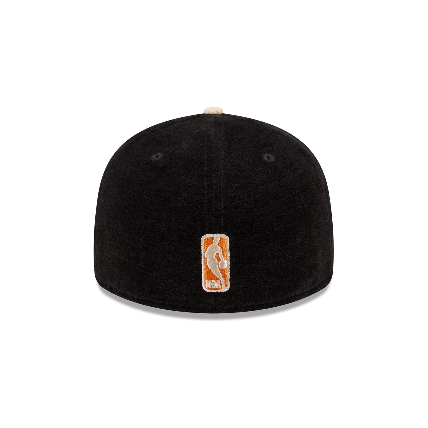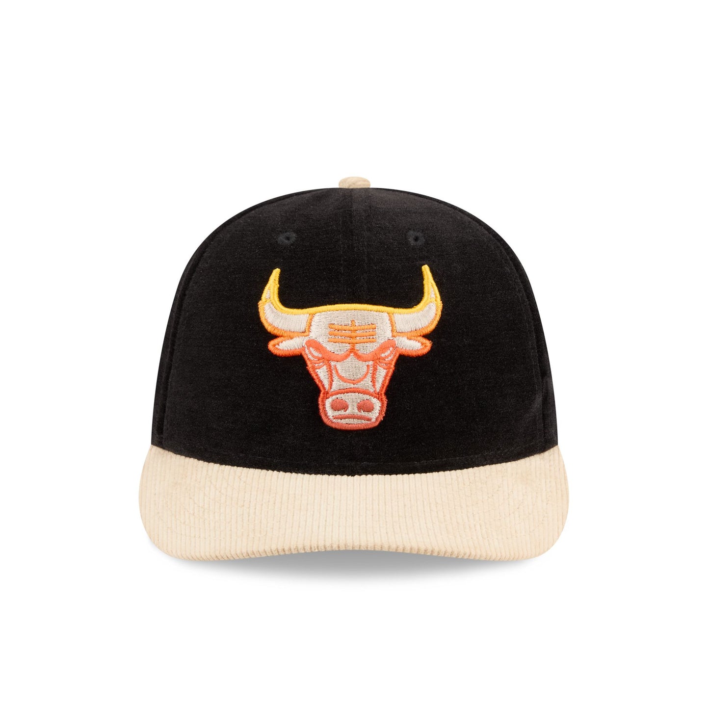 The Chicago Bulls Fall Velvet Low Profile 59FIFTY Fitted Cap features an embroidered Bulls fall gradient logo at the front panels against a velvet fabrication throughout. Additional details include an antique brass leather stitch down city plate at the right-wear side, a matching NBA Logoman at the rear, and a green undervisor.