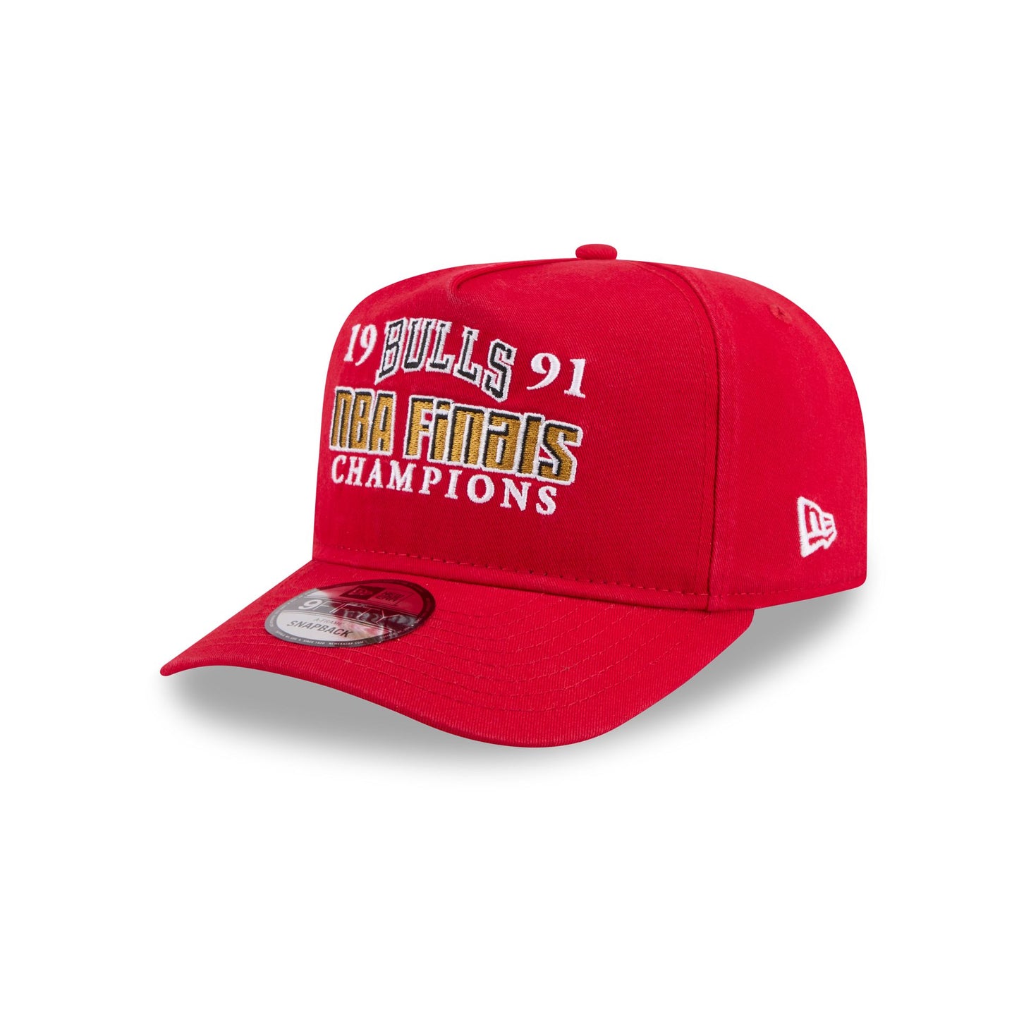 The Chicago Bulls Historic Win 9FIFTY A-Frame Snapback features an embroidered Bulls graphic highlighting a historic victory at the front panels and a team logo at the right-wear side. Additional details include an adjustable snapback closure at the rear and a green undervisor.