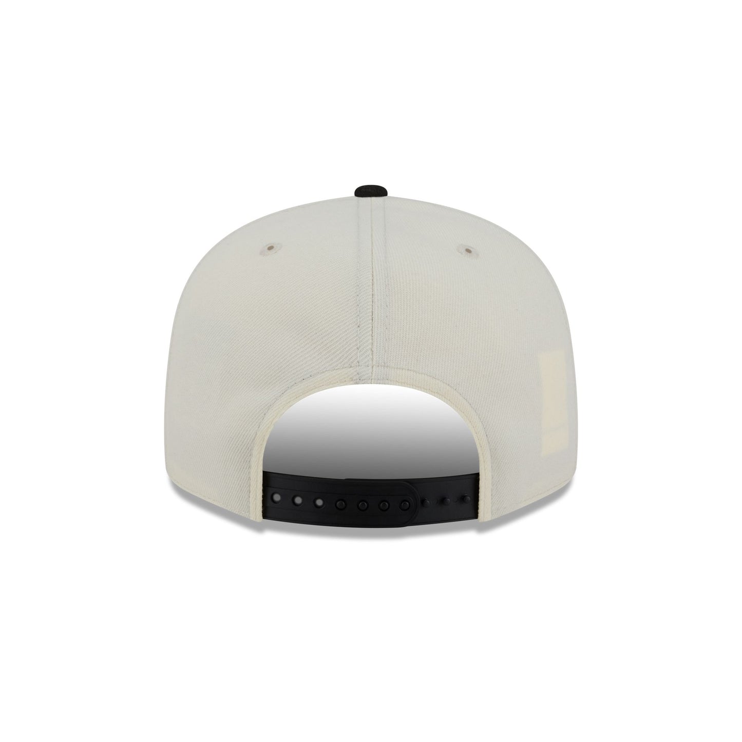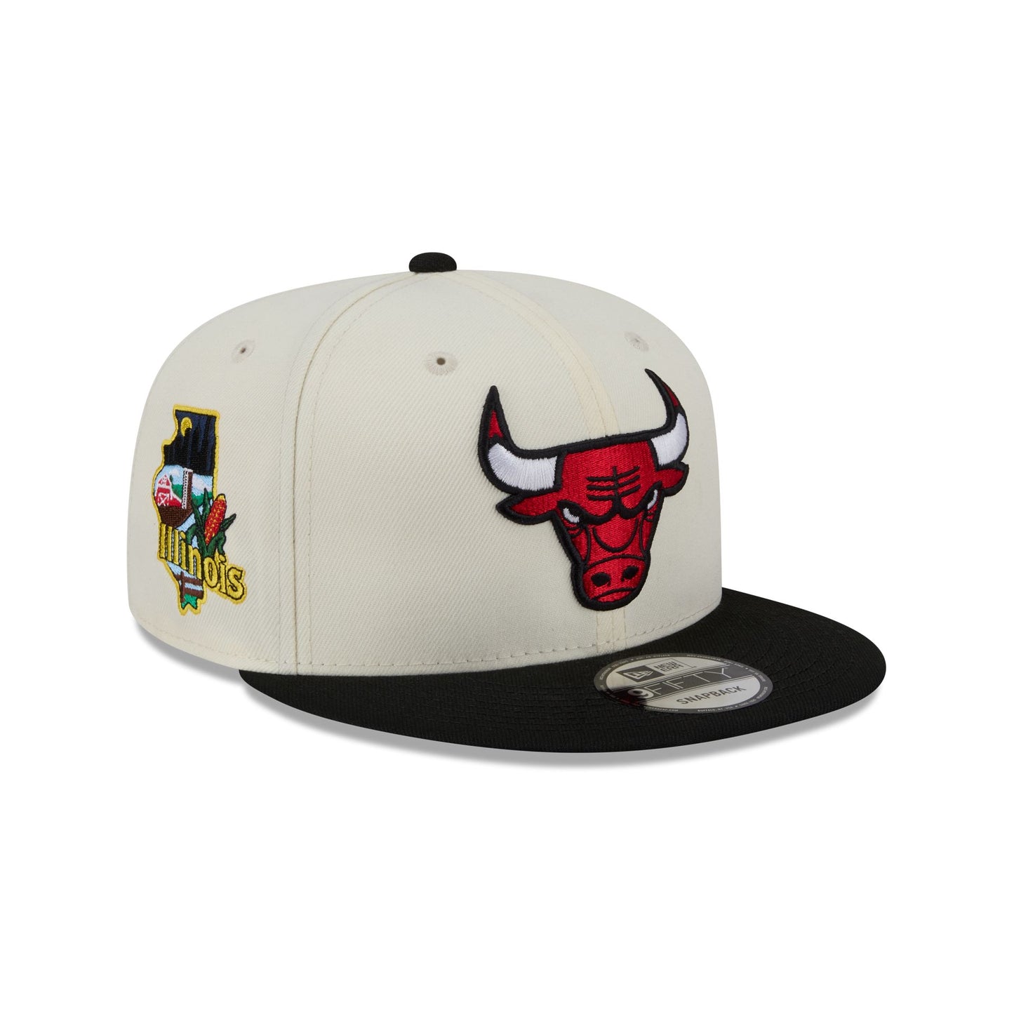 The Chicago Bulls Localized 9FIFTY Snapback features an embroidered Bulls logo at the front panels with a state patch at the right-wear side. Additional details include an adjustable snapback closure at the rear and a green undervisor.
