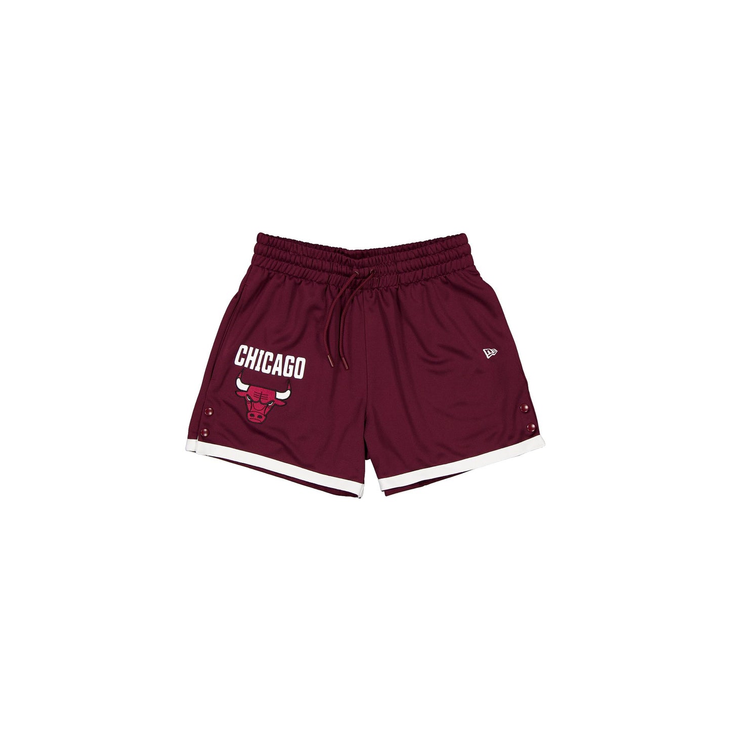 The Chicago Bulls Logo Dark Red Shorts features an embroidered Bulls felt logo at the front right leg with pockets and adjustable drawstrings.